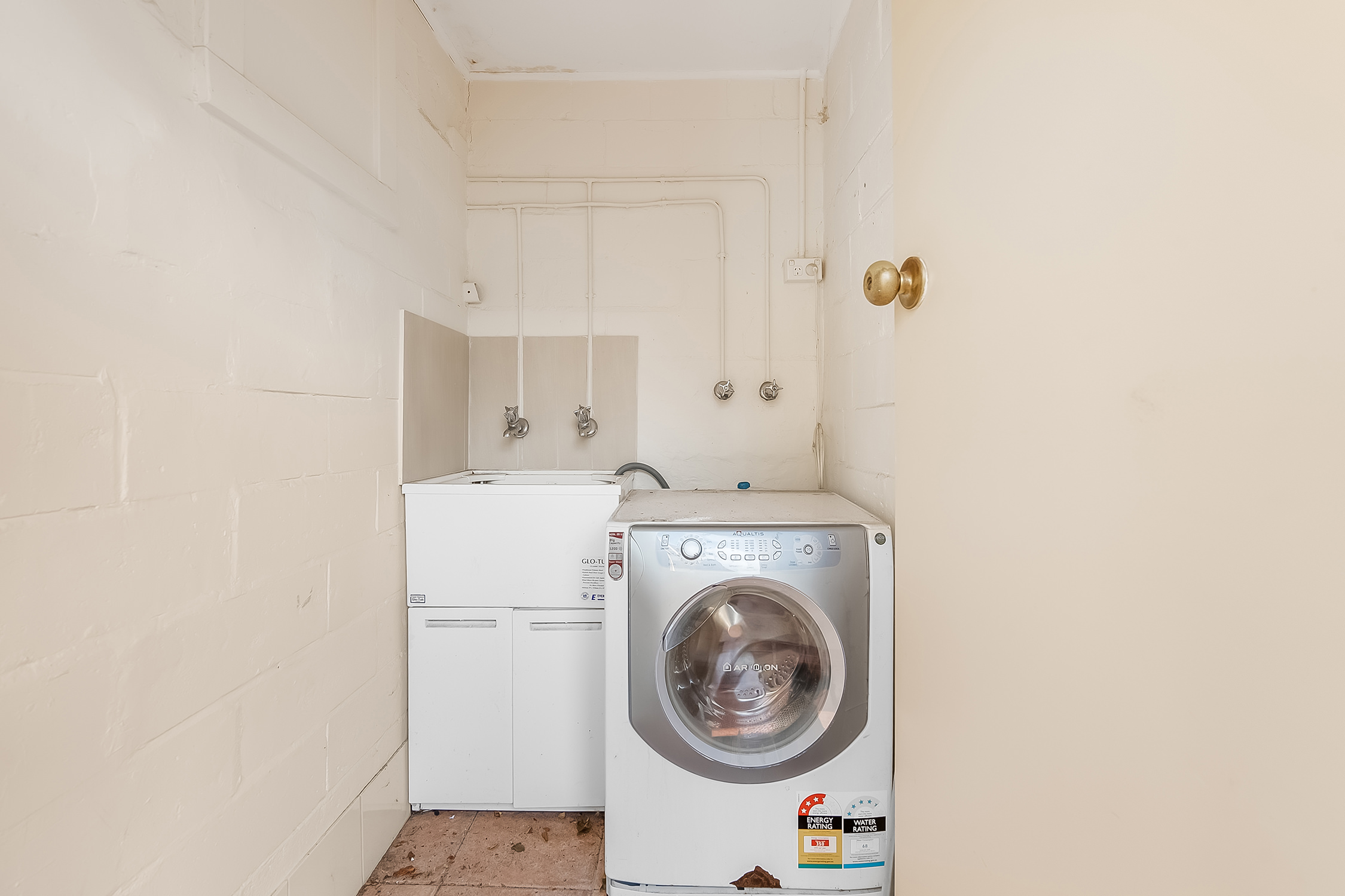 • External laundry area equipped with a washing machine, keeping internal living spaces uncluttered