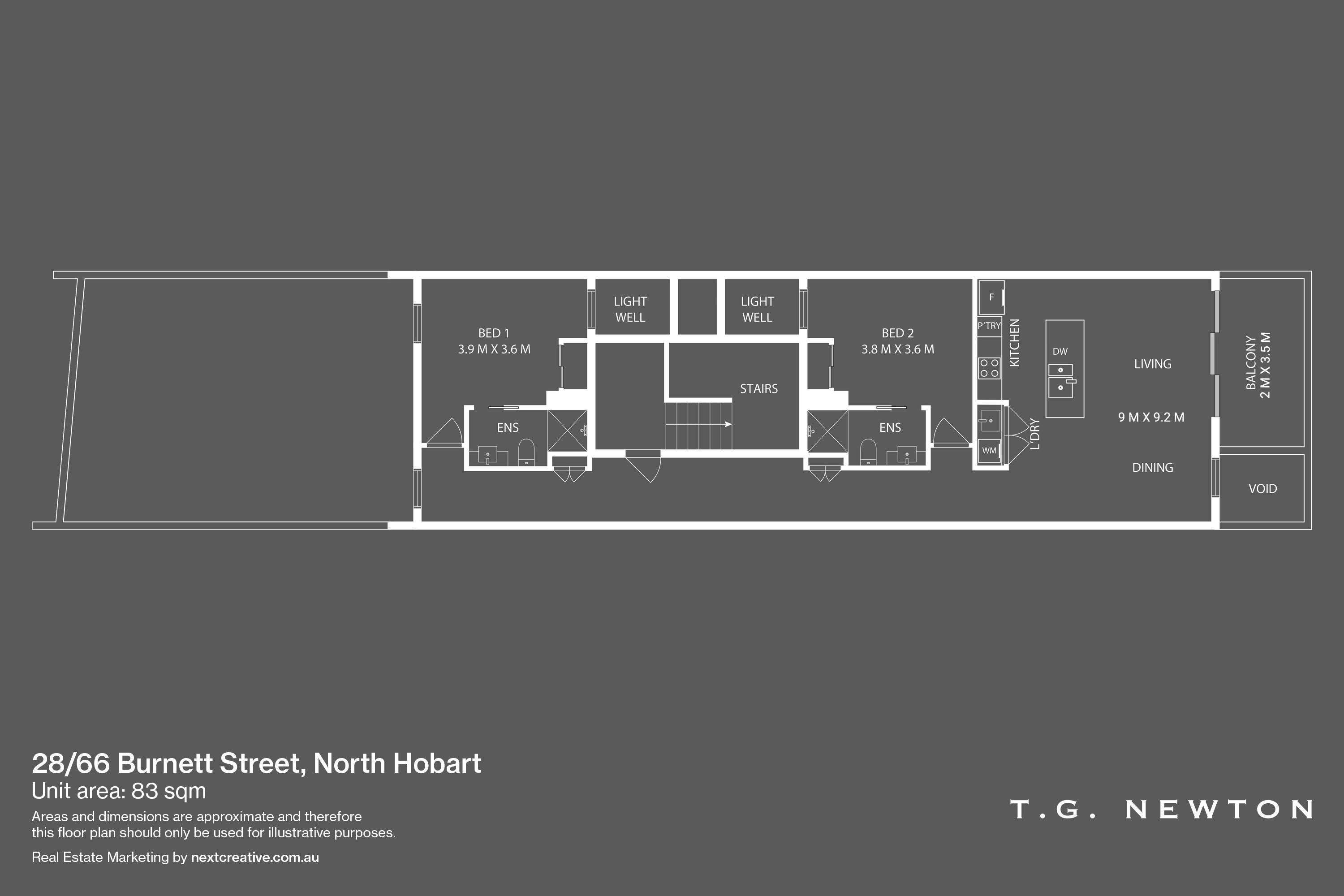 Spanning 83sqm + balcony, this unit features an open-plan living and dining area, perfect for entertaining or relaxing after a long day. The well-appointed kitchen is equipped with a dishwasher and ample storage, making meal preparation a breeze. Both bedrooms come with built-in robes, & their own en-suite.