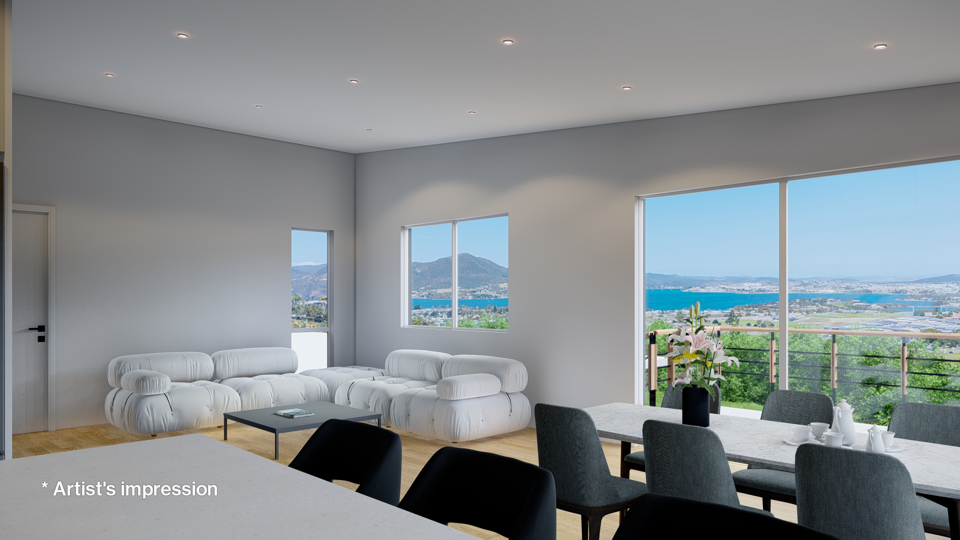 Each dwelling faces north easterly for plenty of natural sunlight and offers stunning water views, overlooking MONA, with impressive rolling mountains in the backdrop & a short commute to the local Claremont golf course.