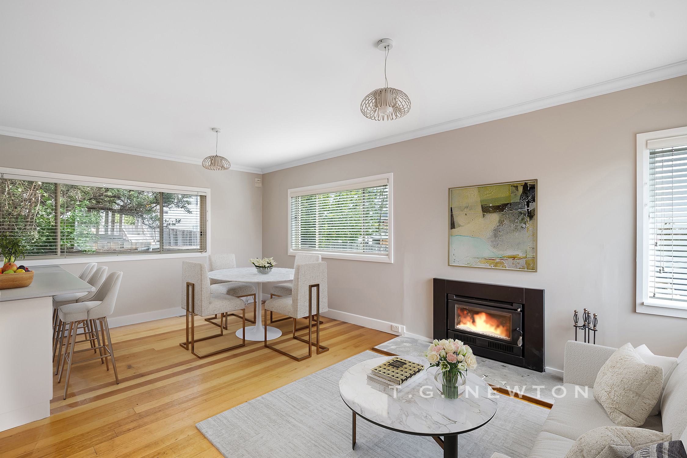 A large living room offers adequate room for the dining table, multiple sitting areas and features a cozy wood heater.