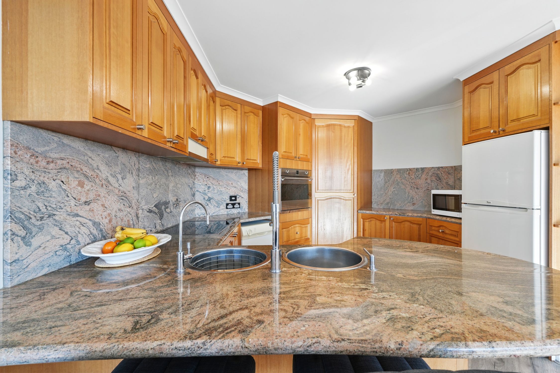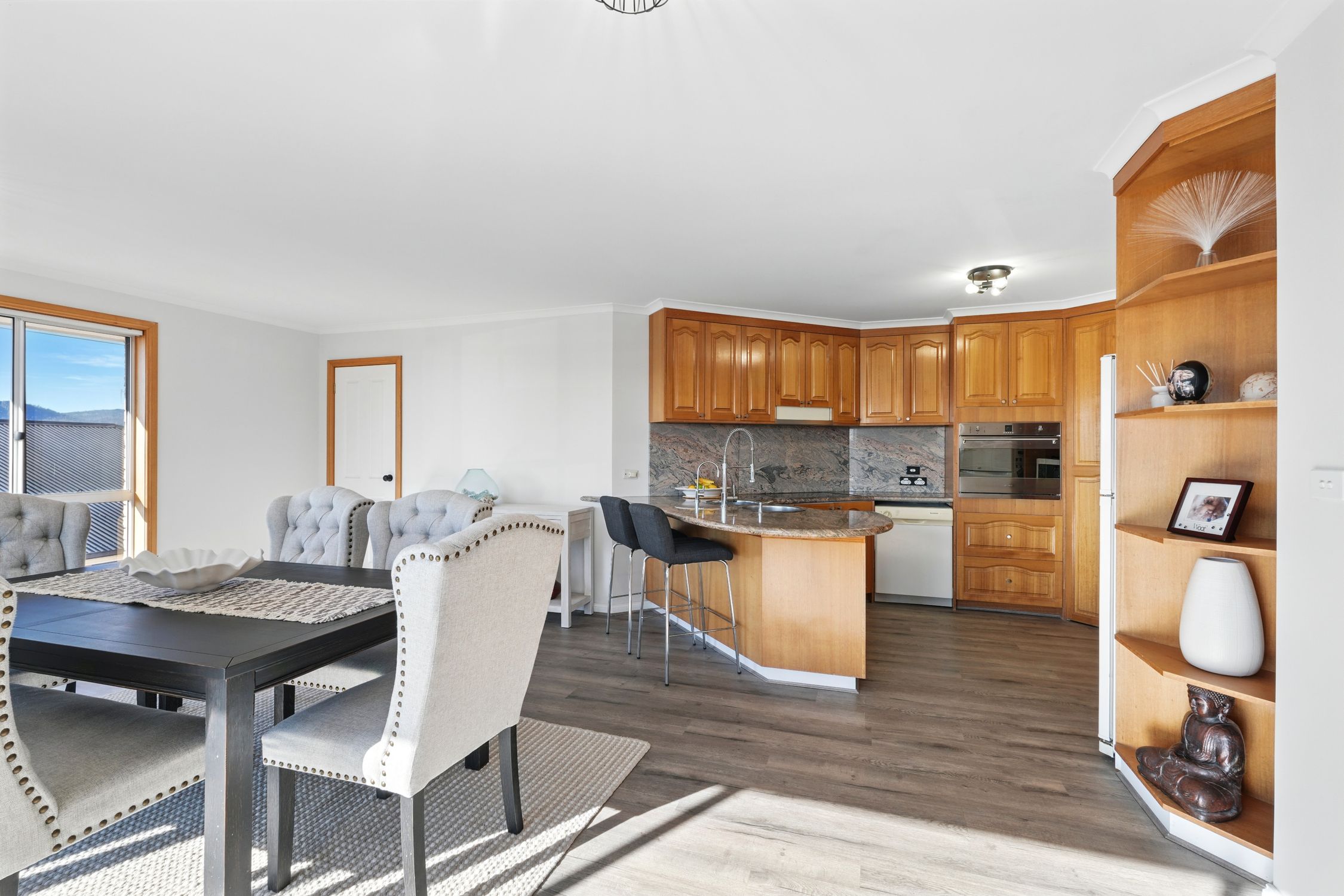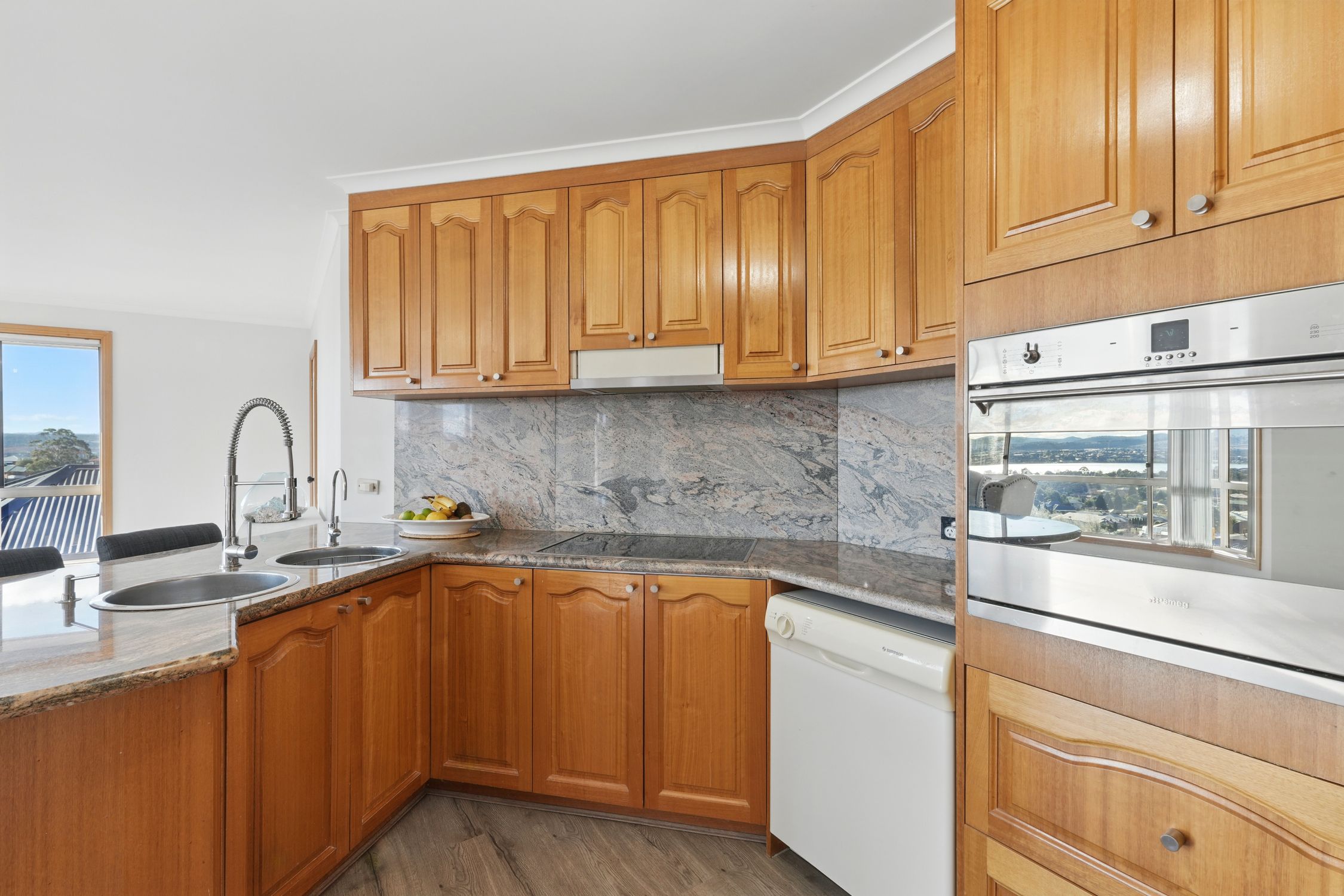 A spacious kitchen with granite benchtops, Smeg wall oven, cooktop and plenty of storage to entertain family and guests.