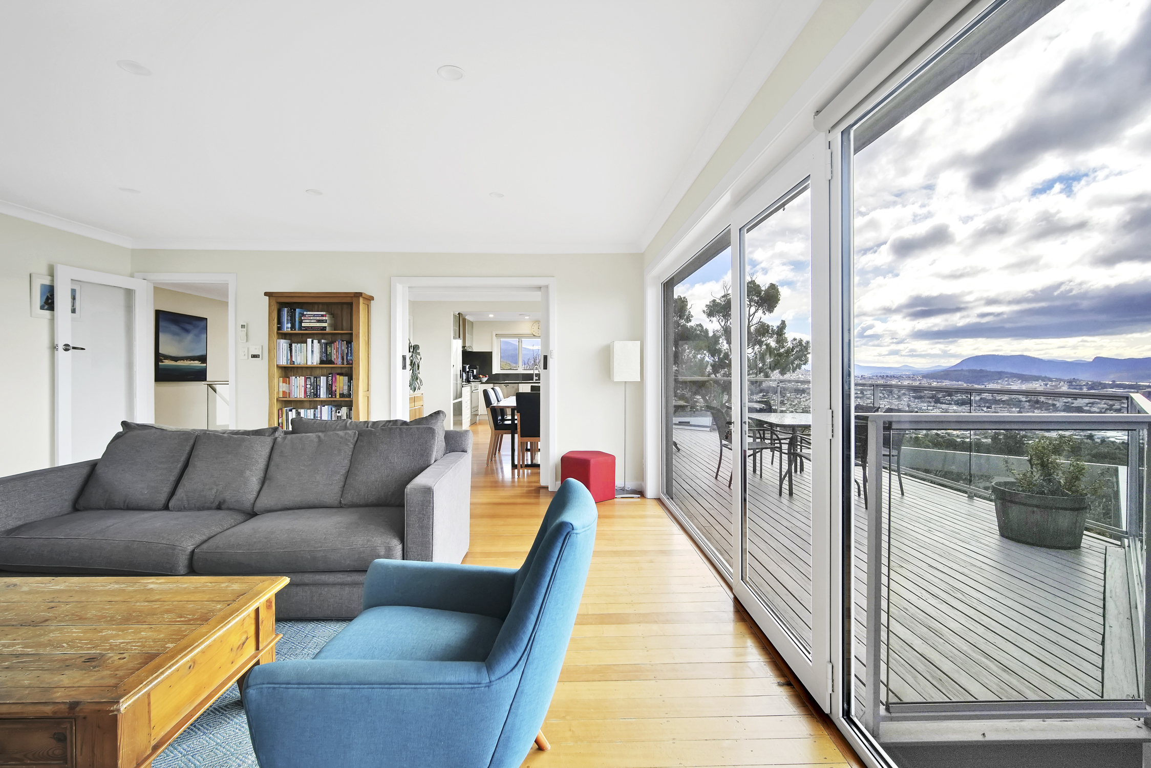 The seamless indoor-outdoor flow is ideal for entertaining. The main living area extends effortlessly onto a spacious deck, where you and your guests can enjoy panoramic views of Sandy Bay, the River Derwent, Wrest Point Casino, and the iconic Tasman Bridge. This deck is not just an extension of your living space; it's a perfect venue for hosting gatherings, offering a stunning backdrop that enhances any occasion.