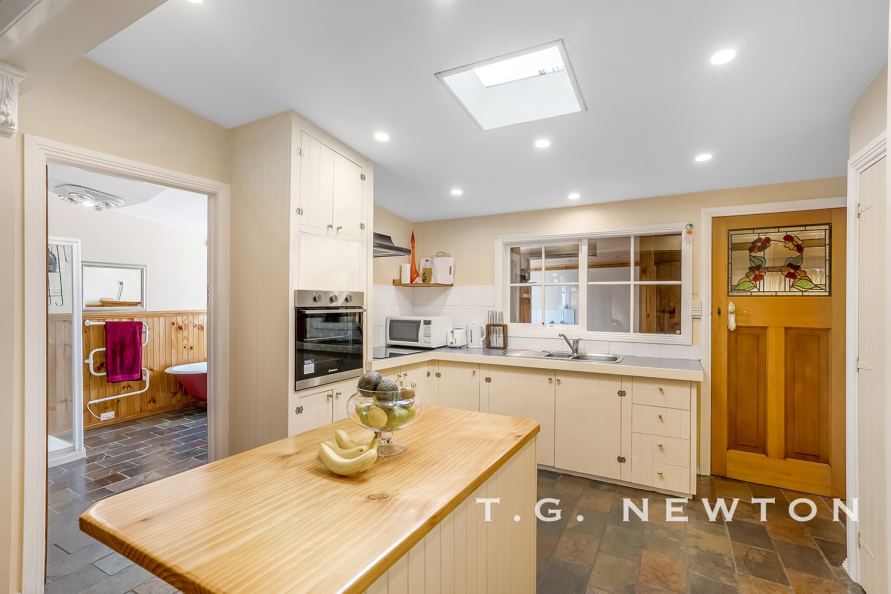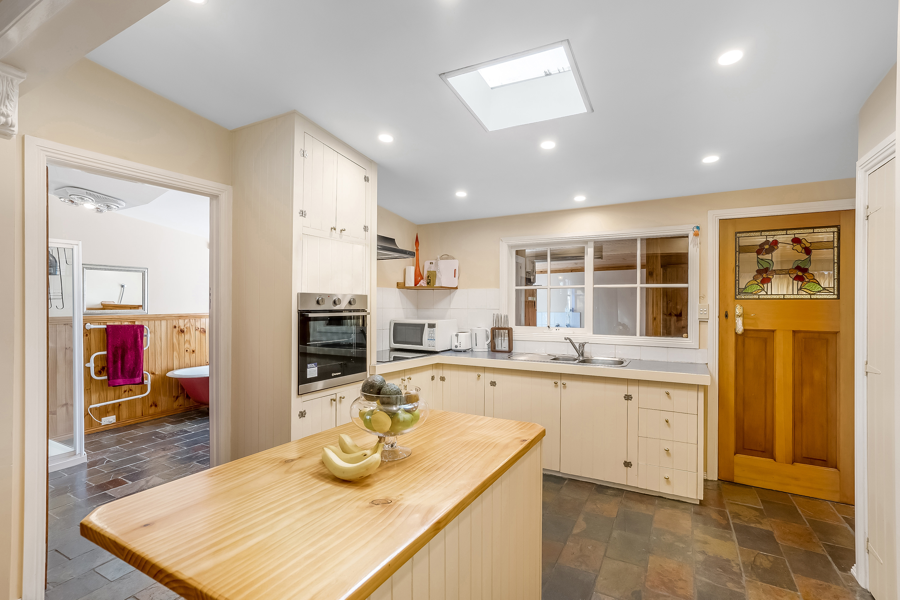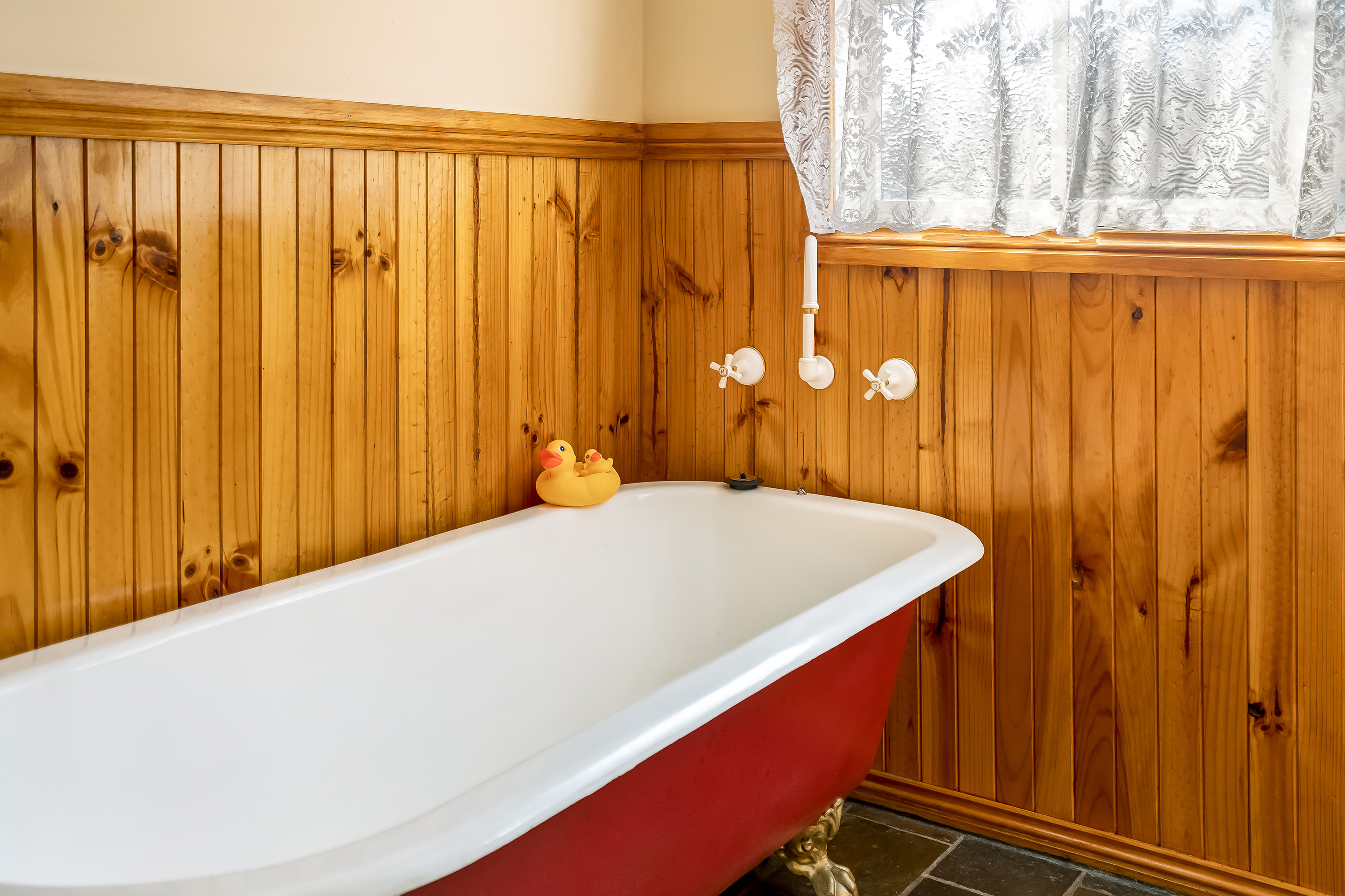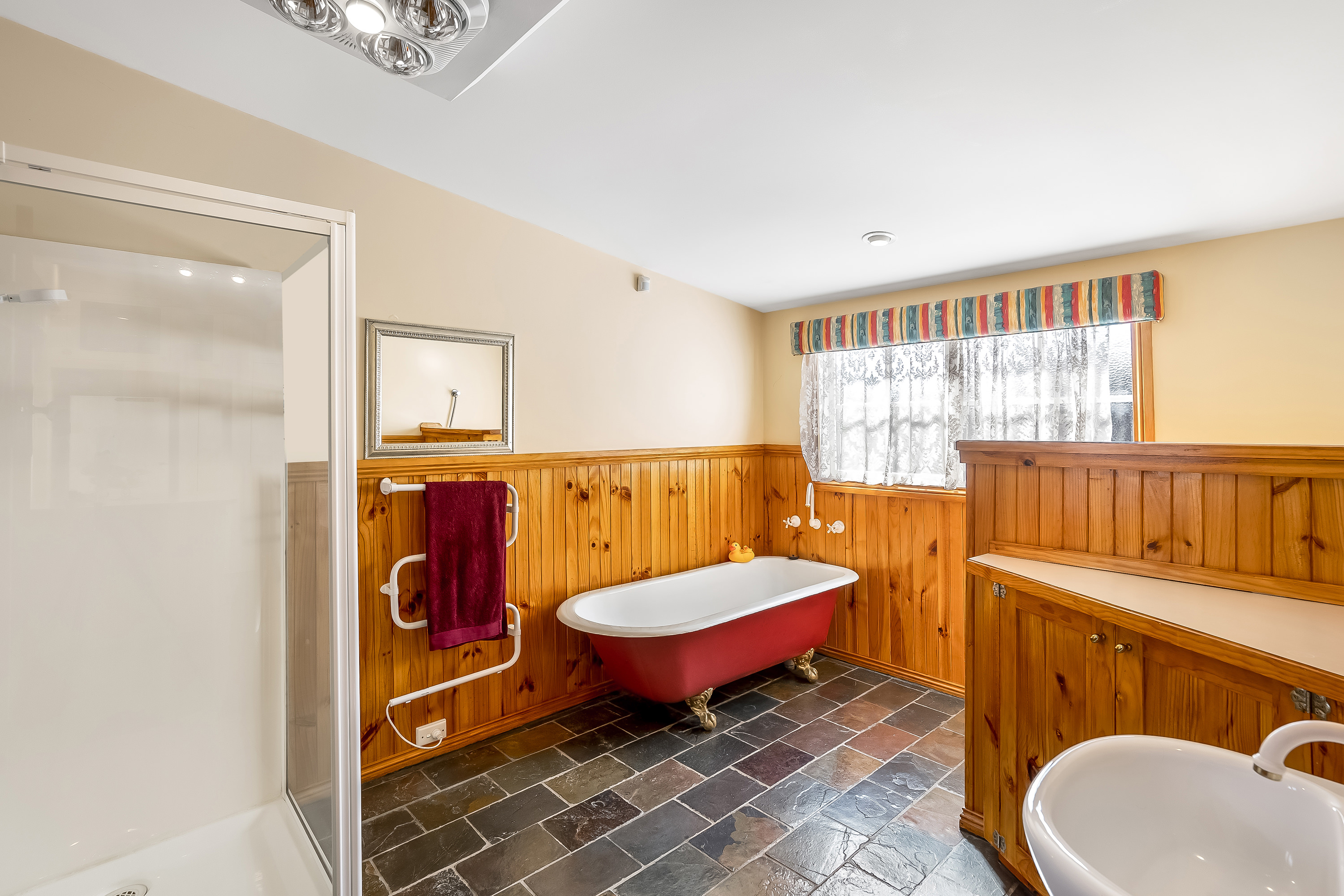 The main bedroom has a large walk-in robe and ensuite. The main bathroom is striking featuring a claw foot bath and separate shower.