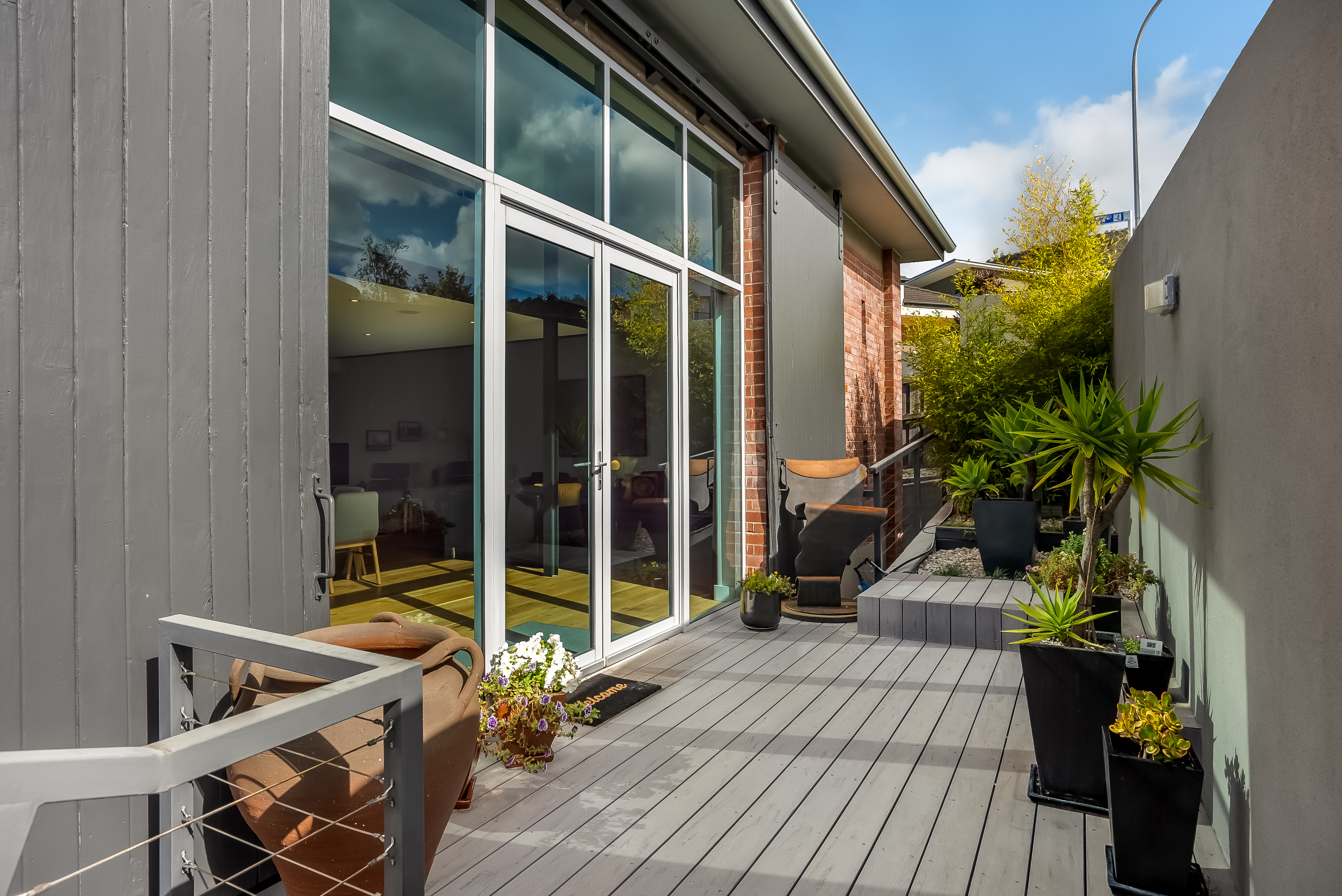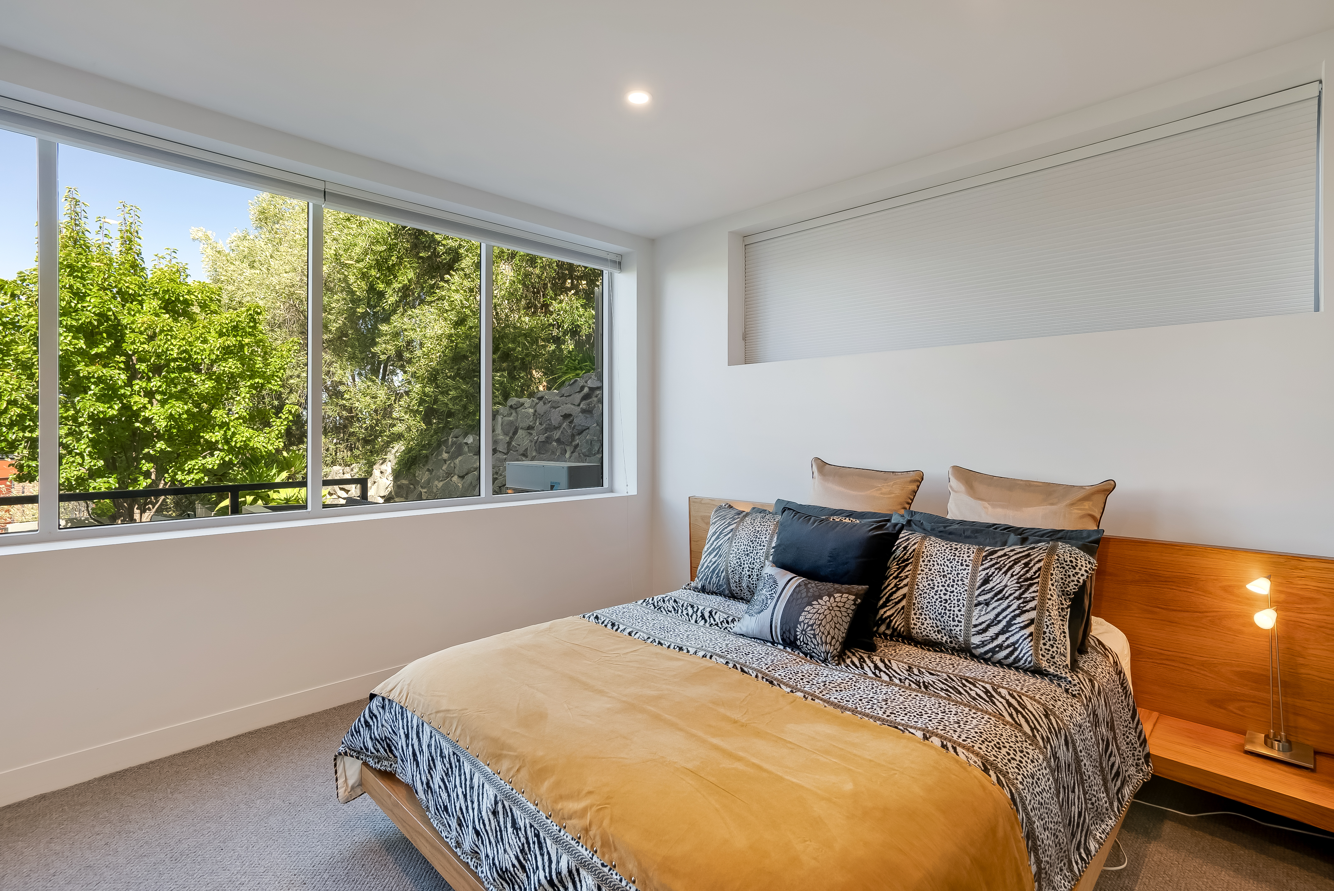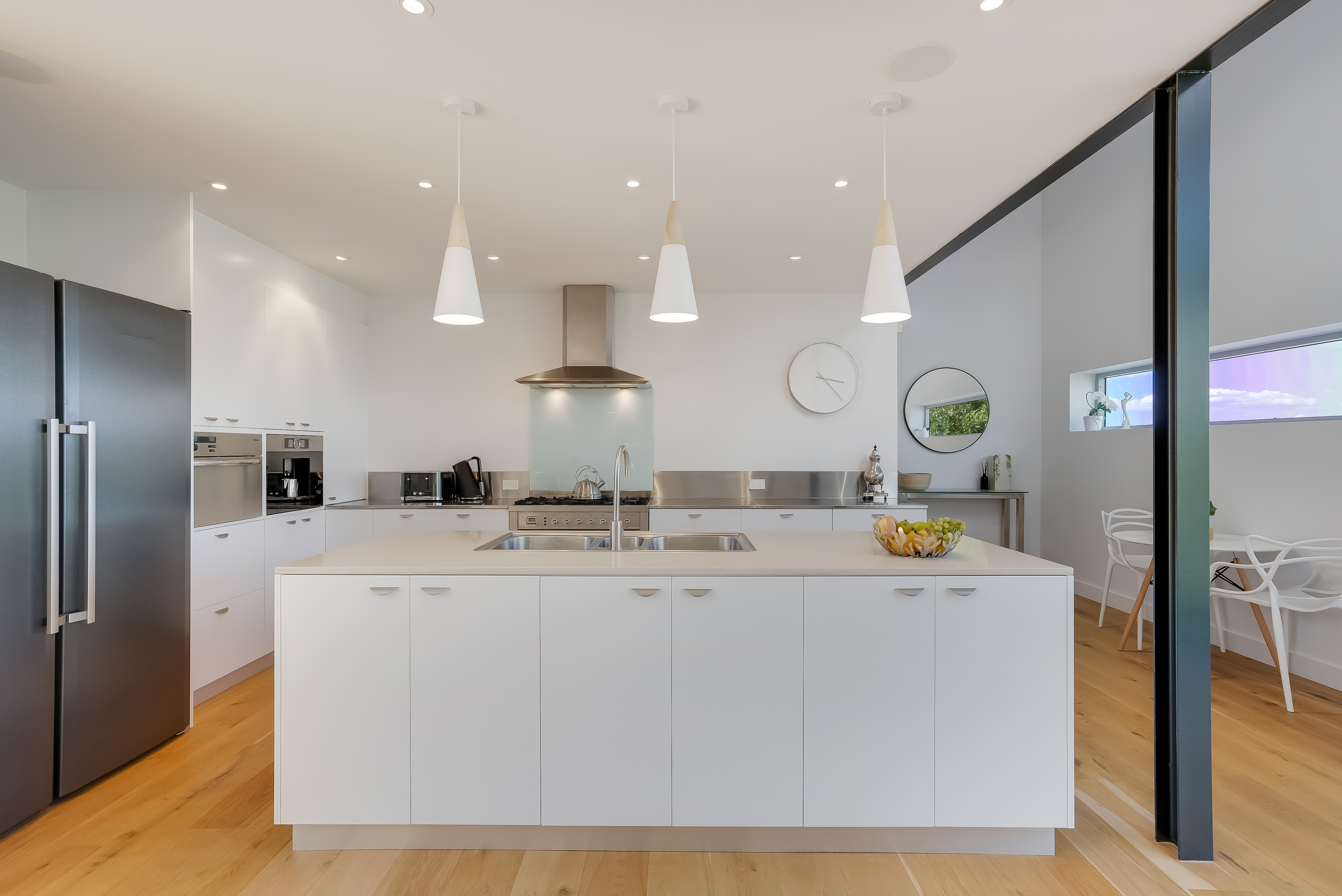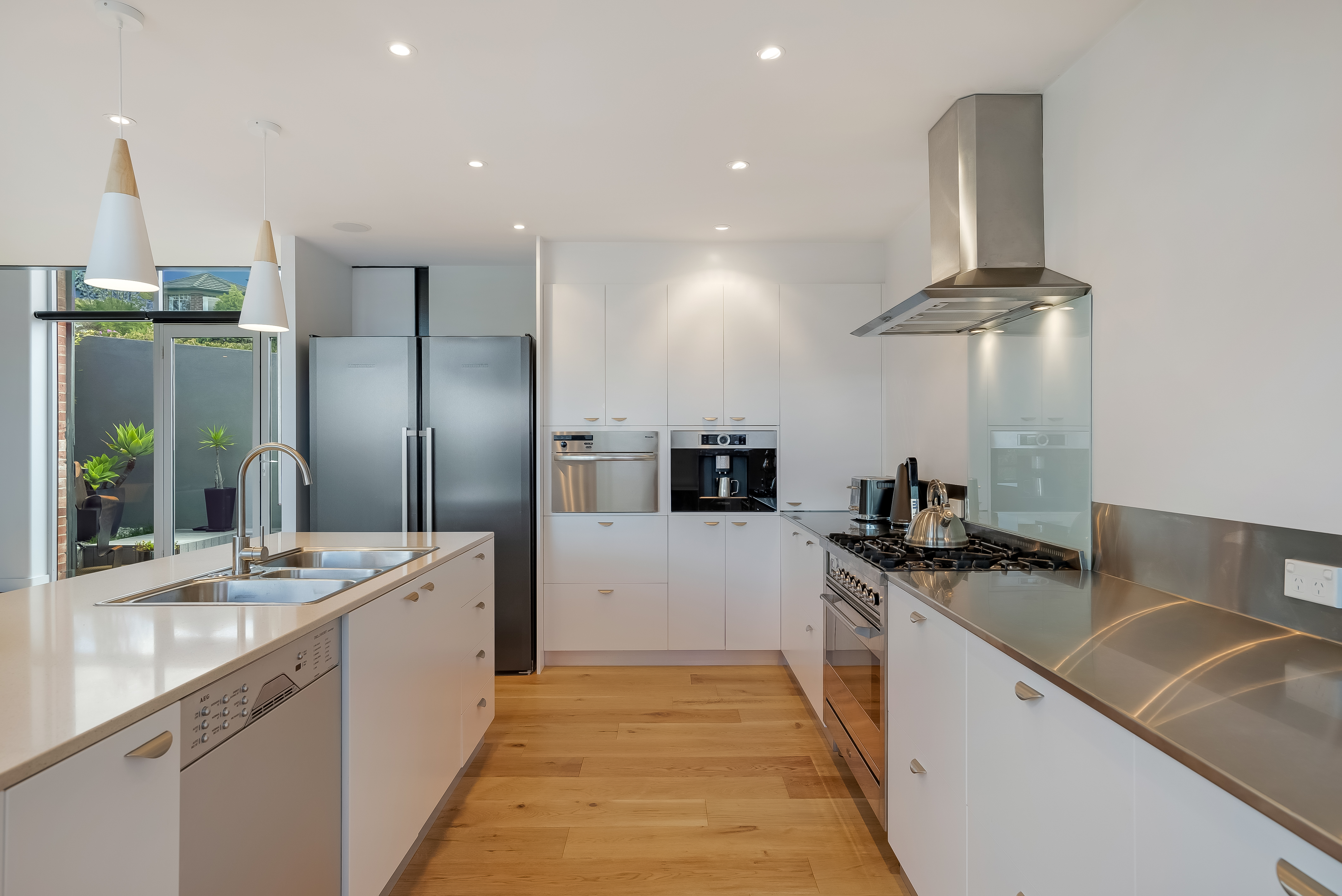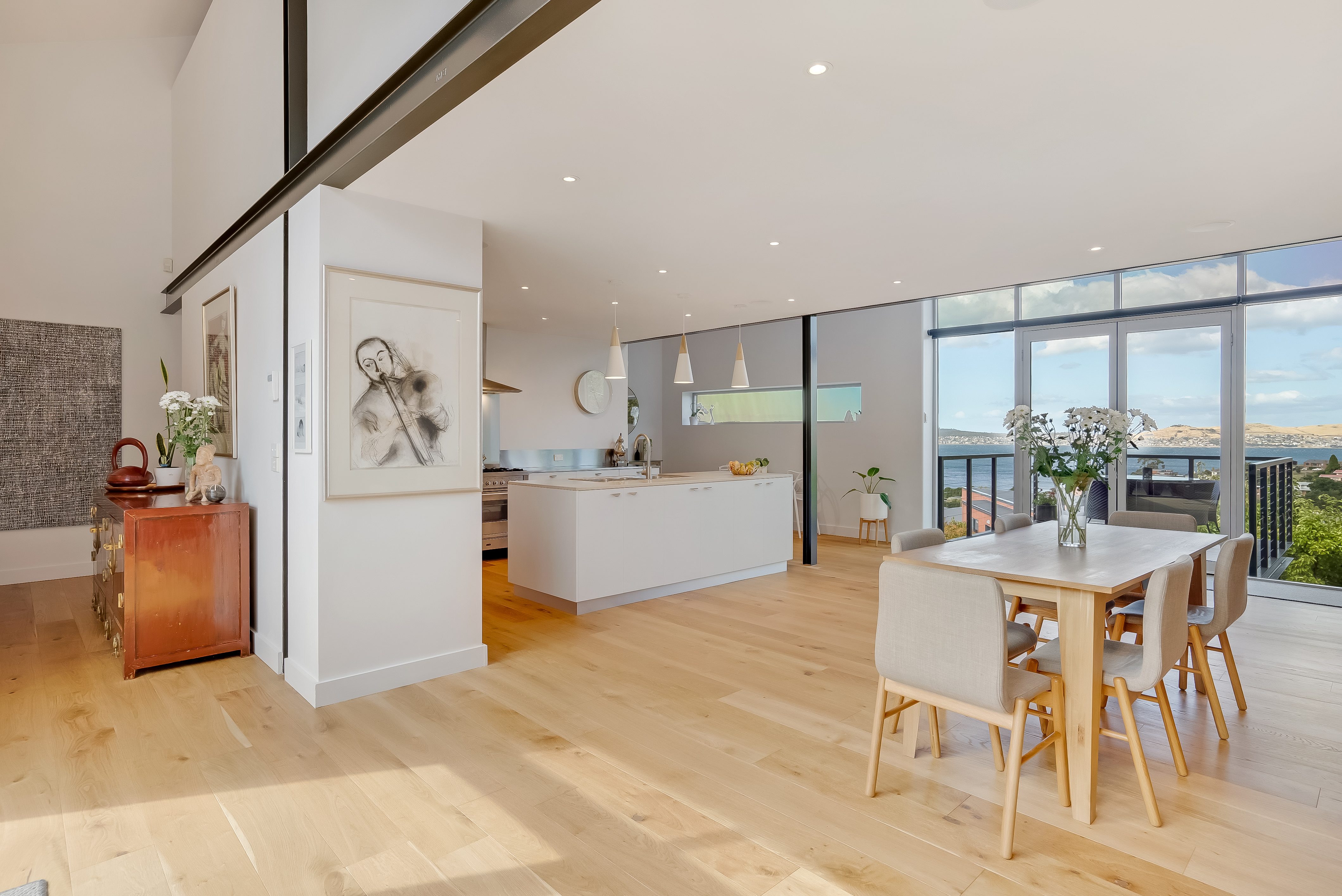 Sunlight streams into this north-easterly facing home and combined with eye-catching double height ceilings, there is an exceptional sense of light and space. Stylish and functional, the kitchen is a delight to cook in and offers plenty of bench and storage space with designer appliances including ILVE gas cook-top and oven, Miele steam oven, AEG dishwasher and Bosch coffee machine. A long picture window that runs the length of the kitchen, perfectly captures the distant hills and blue water in the distance.