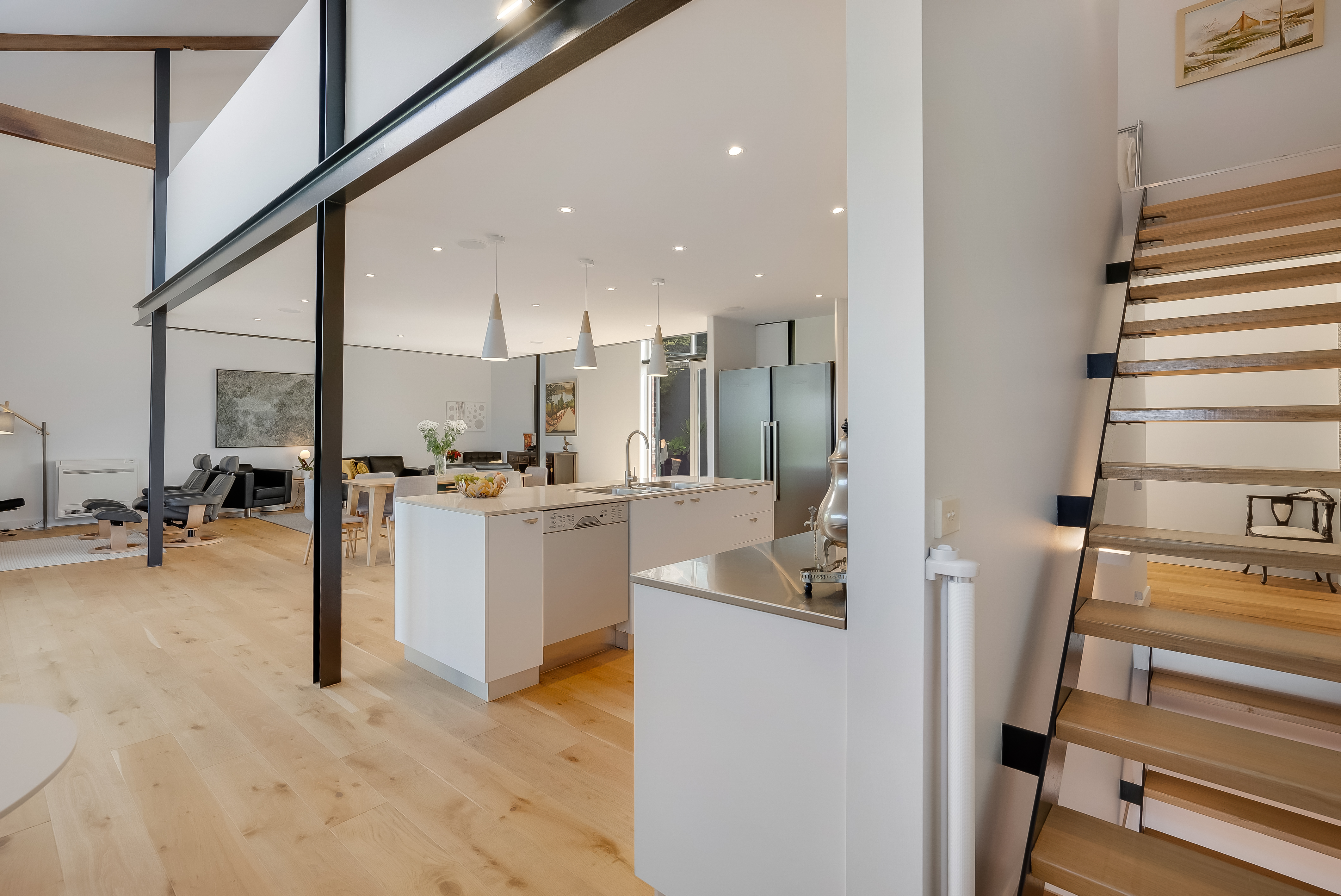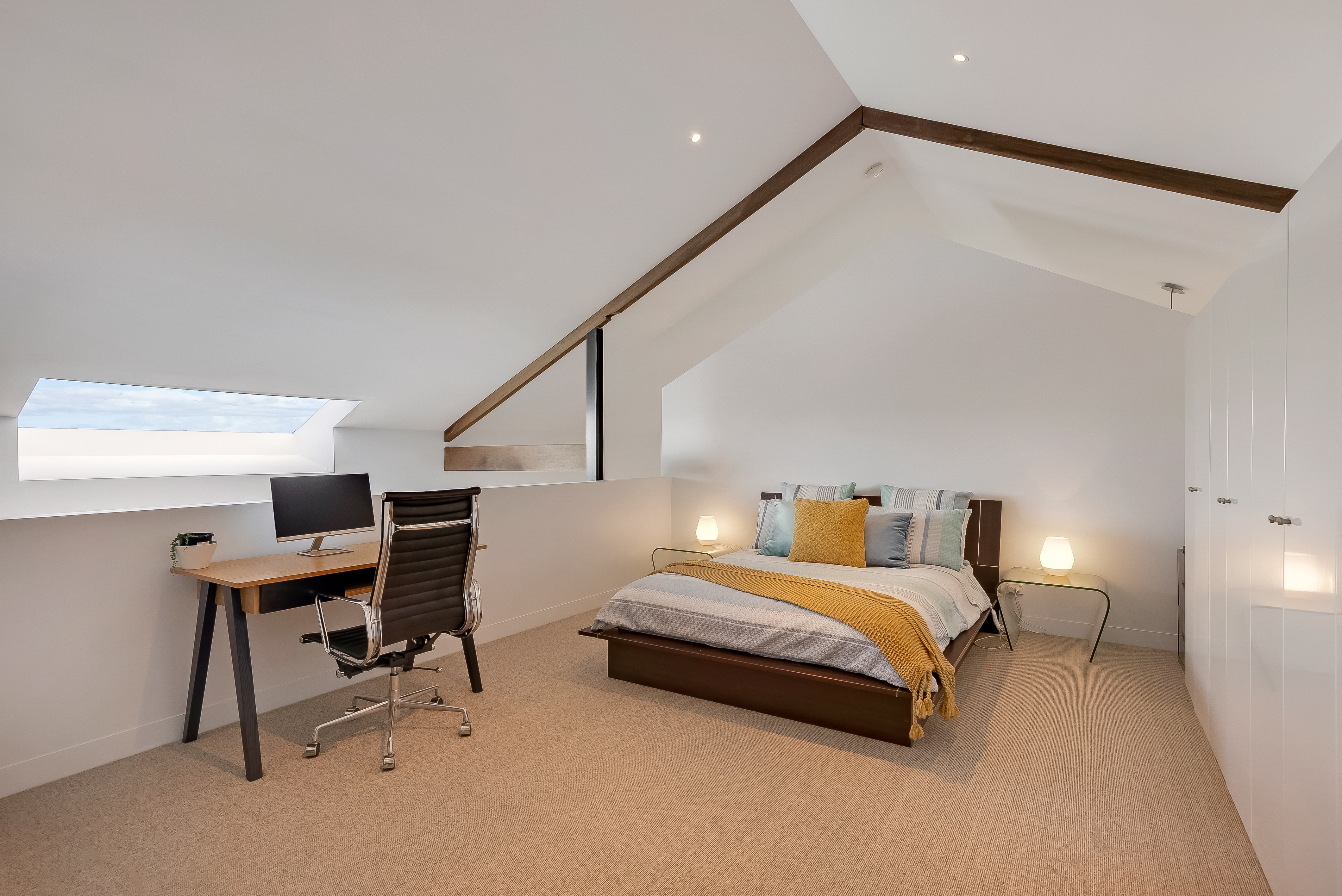 At the top of the home, the mezzanine level offers the most amazing loft guest room that brilliantly showcases the engineering & architectural highlights of the home. With an expanse of wardrobes plus a private ensuite, this area is spacious enough to easily fit a king-sized bed plus room for a sitting area, making it ideal for wowing guests or could be used as a teenage retreat.