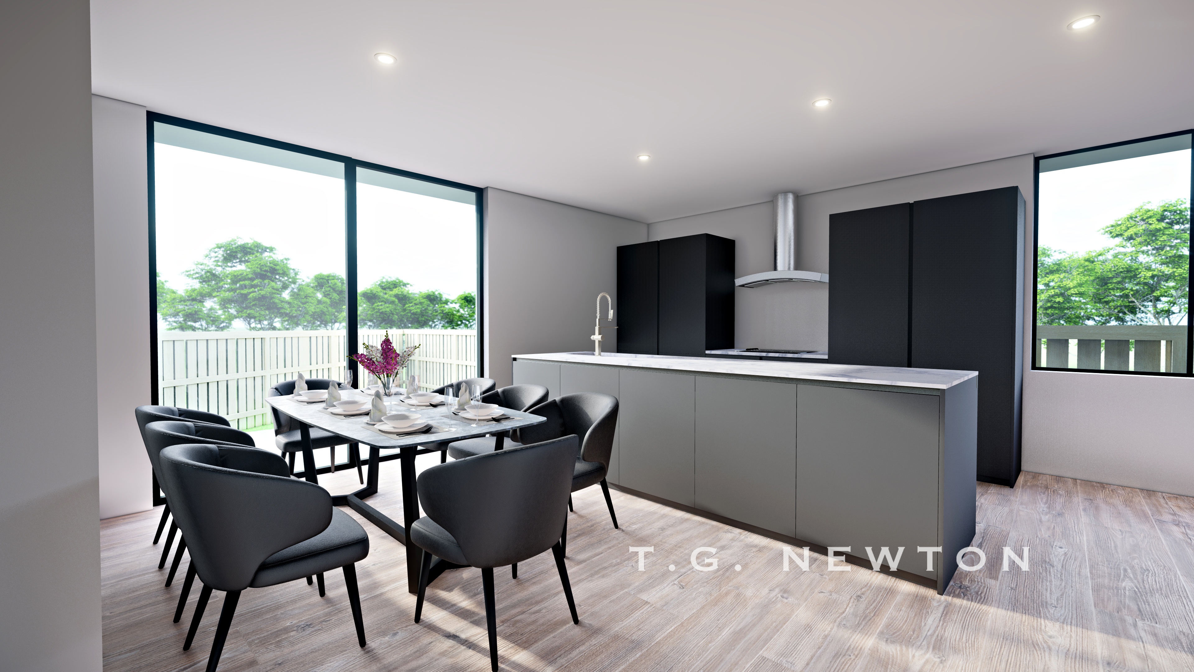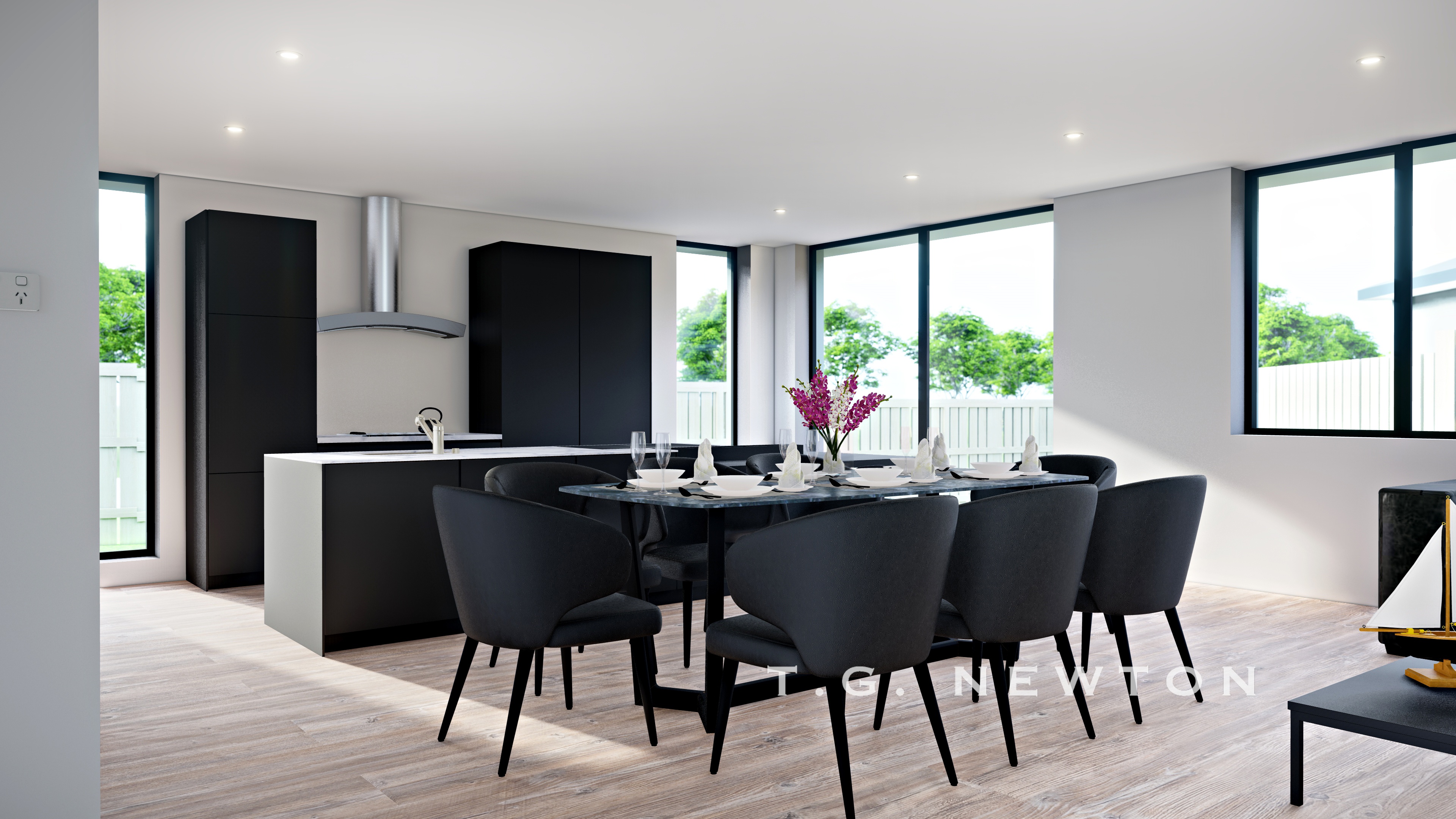 - An open living area inclusive of the Kitchen, Dining and formal Lounge. The kitchen includes oven with range-hood and dishwasher plus an island bench with washing sink