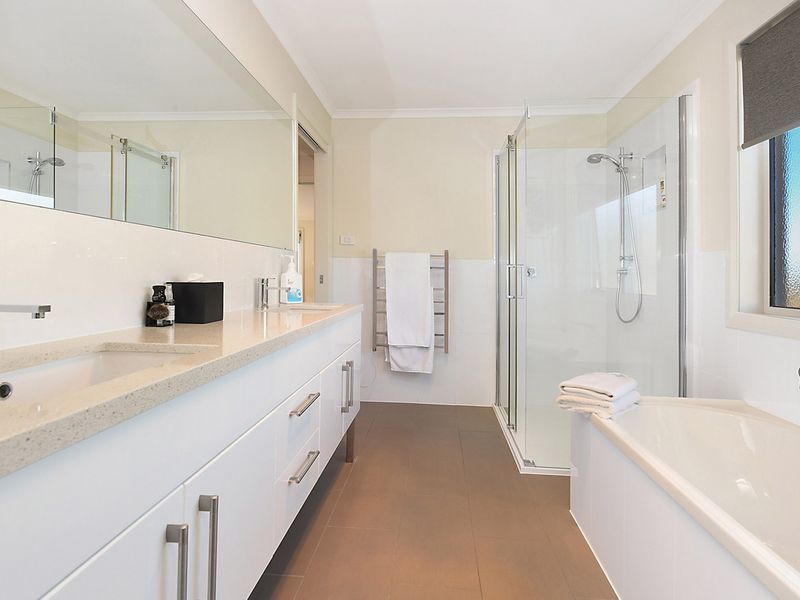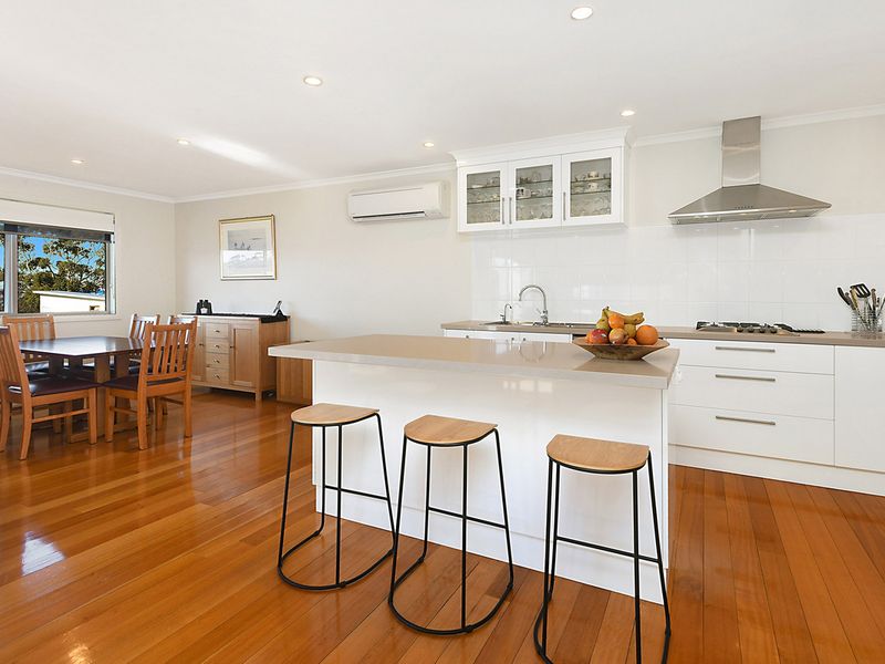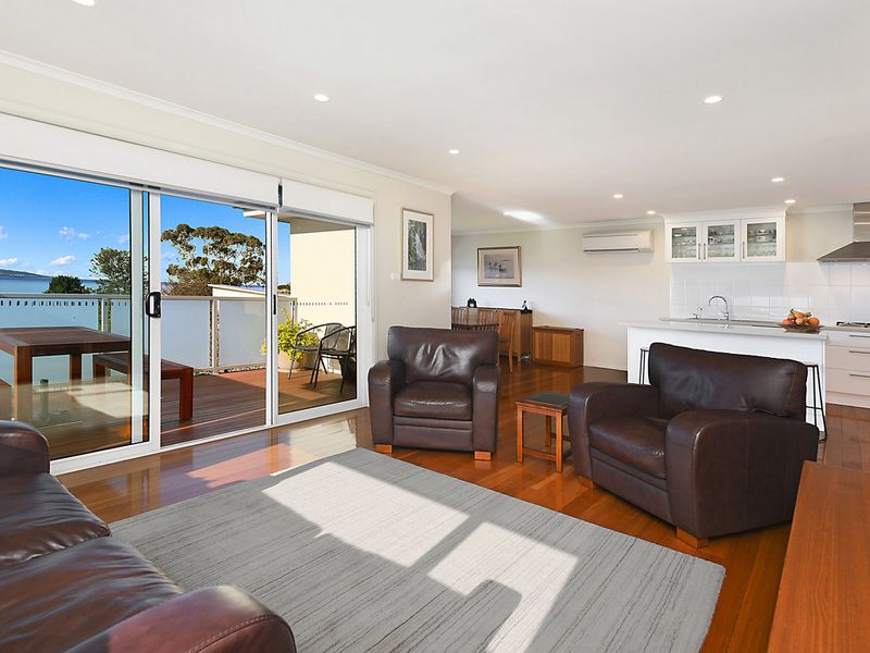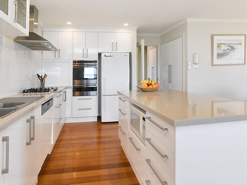 The lovely deck located off the living room captures the stunning panoramic water views and is perfect for outdoor entertaining and alfresco dining. The quality kitchen showcases Miele appliances, plenty of storage options and stone composite bench tops.