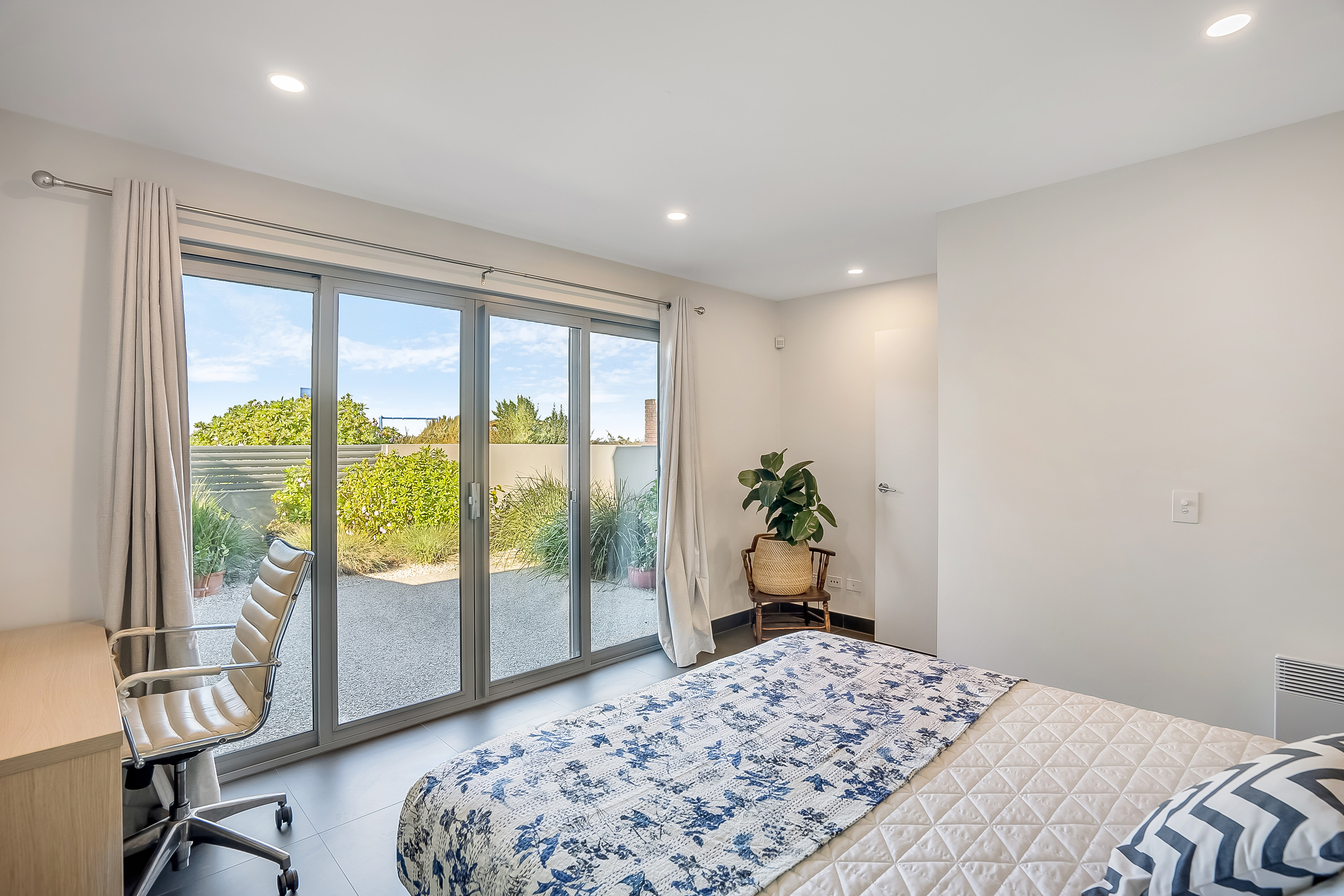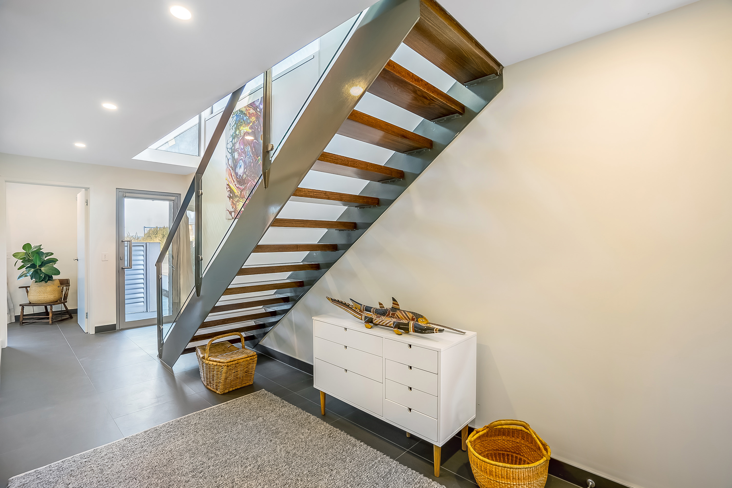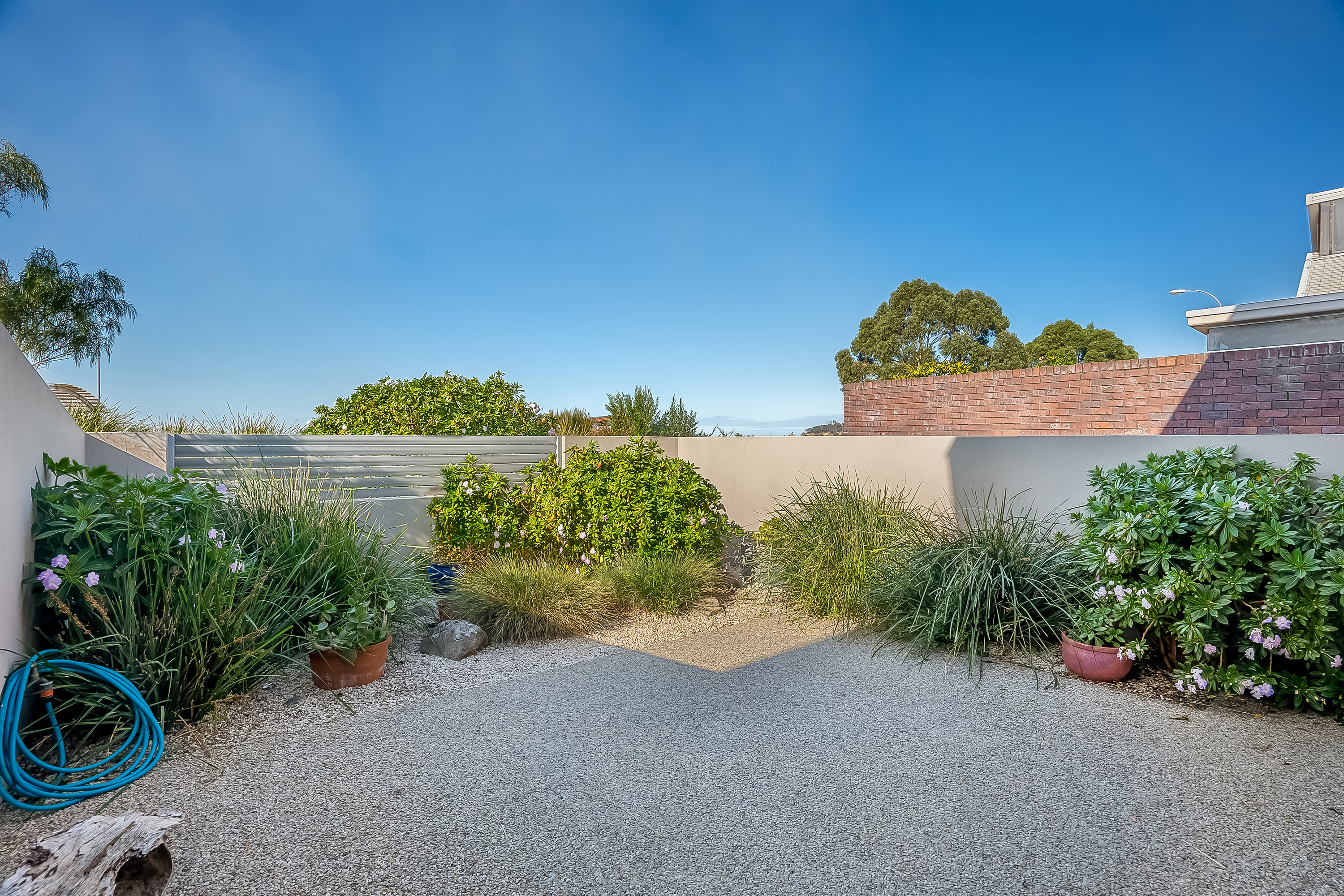 The ground level features an exquisite entry with a statement staircase to the upper level, the perfect place to welcome guests. There are two well-sized bedrooms, a modern bathroom with both a bathtub and shower and a separate toilet for convenience. The laundry is also located on this level. The larger of the two bedrooms has built in wardrobes and opens out to a fully enclosed courtyard that is attractively landscaped with low maintenance plants.