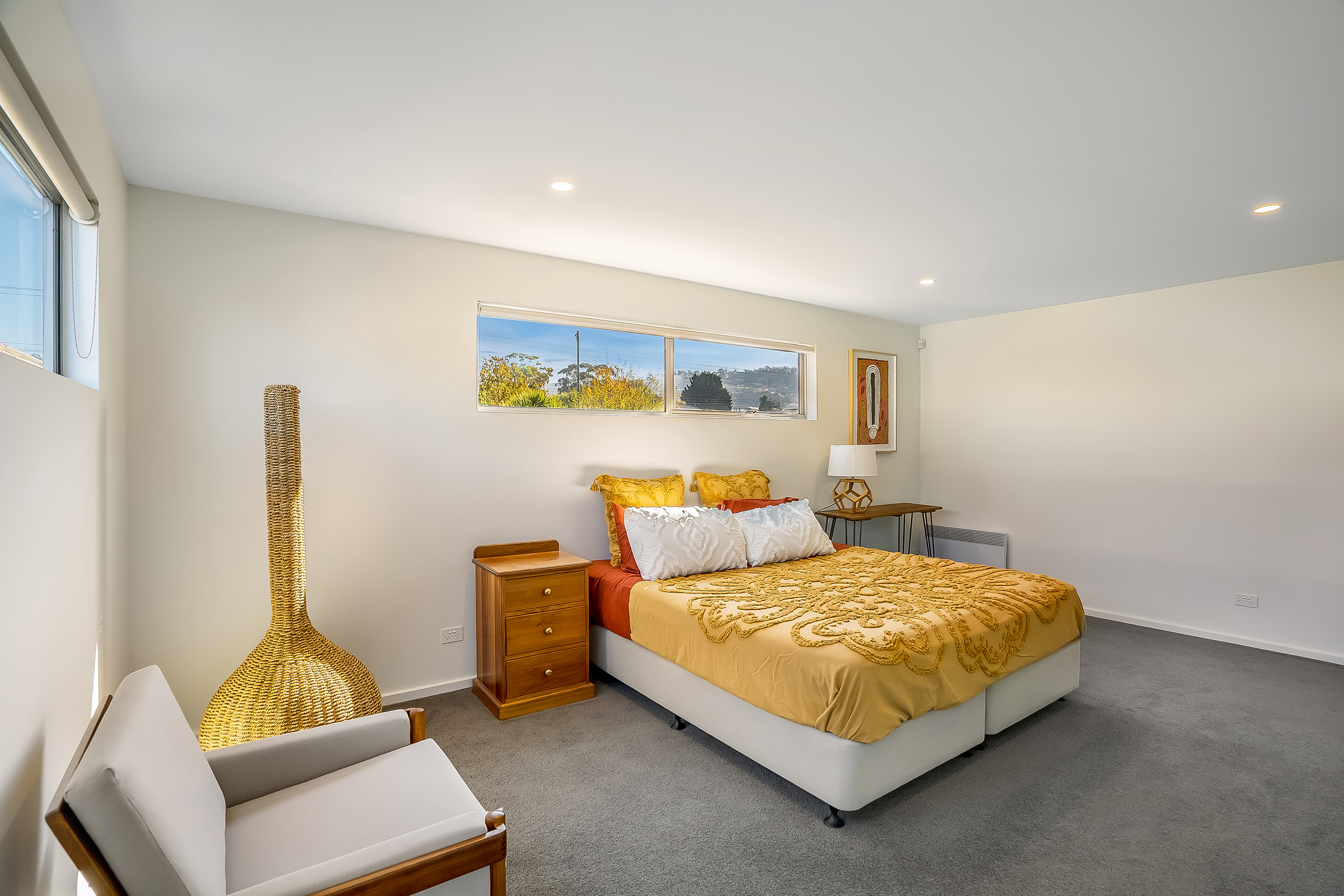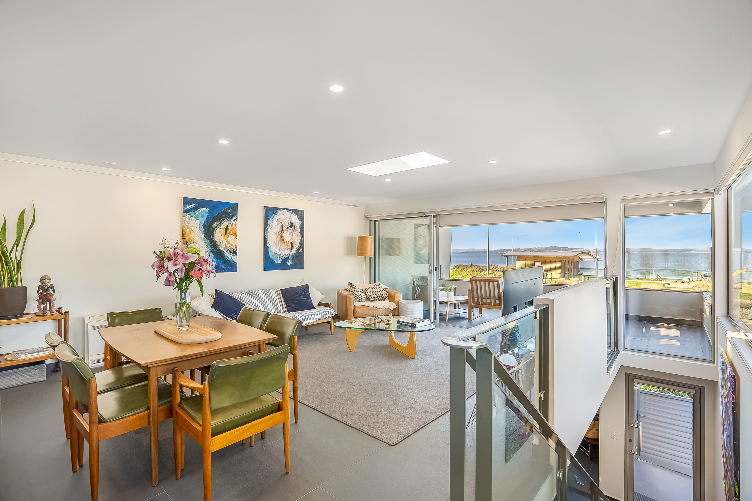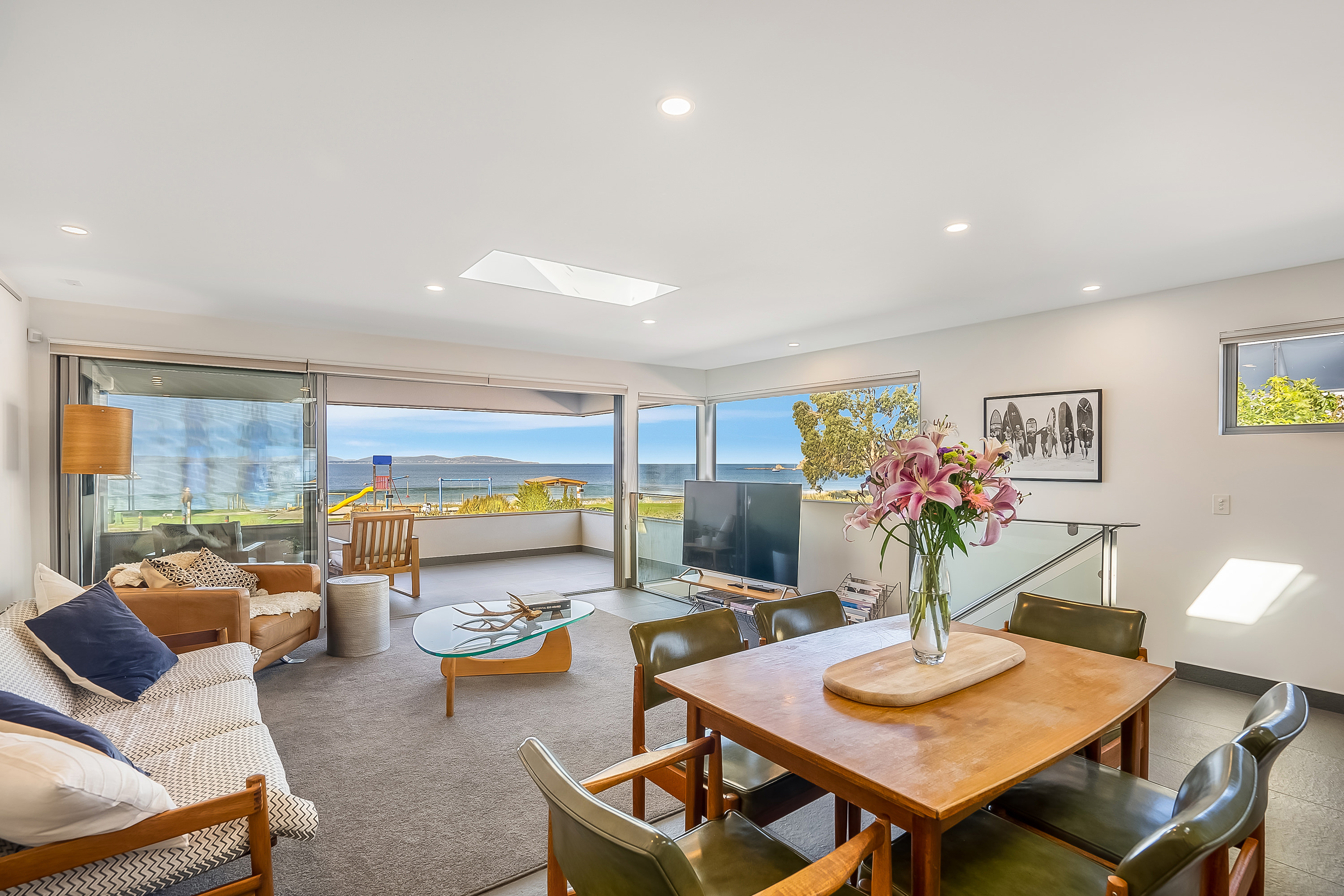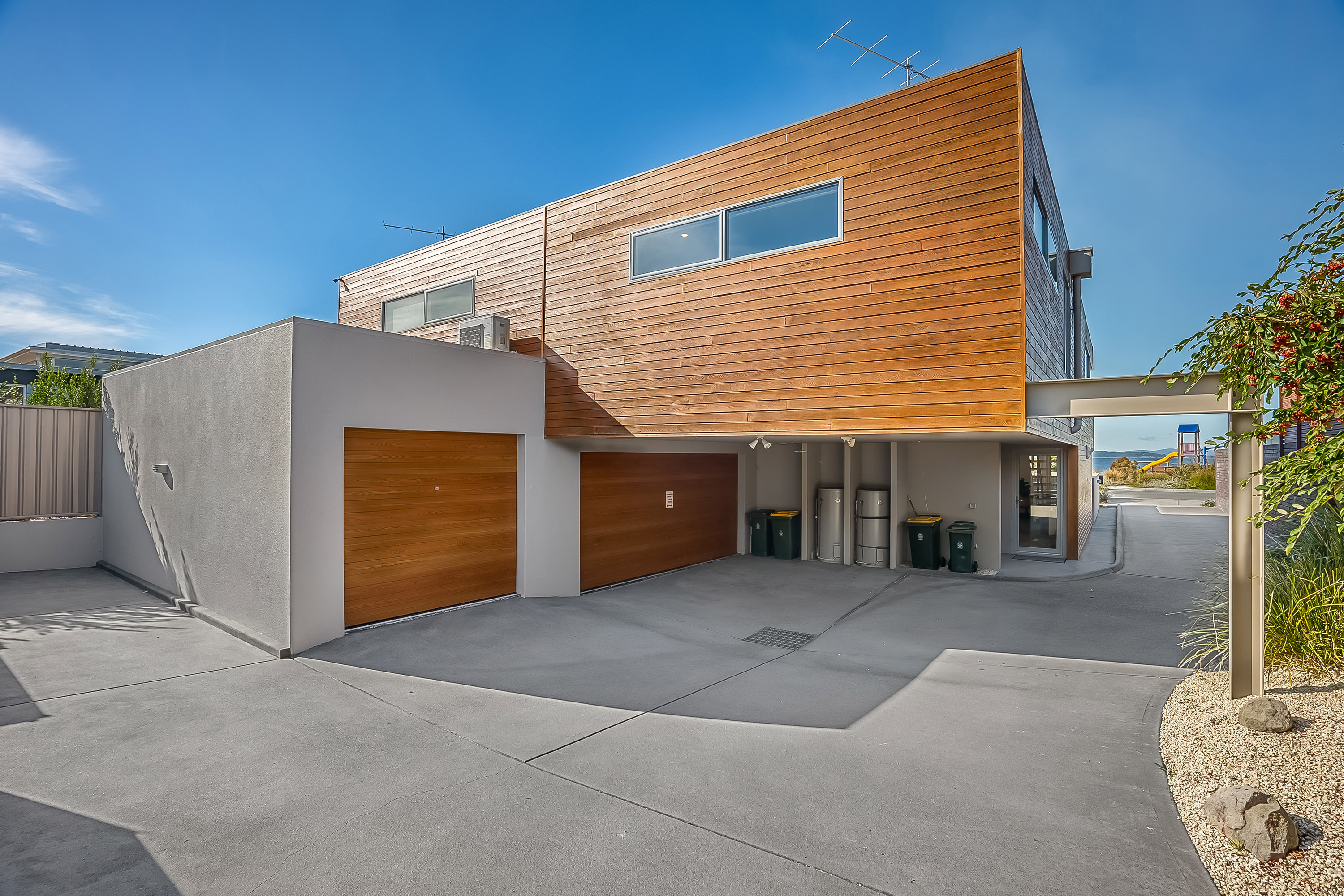 The cerulean waters of Blackmans Bay are framed by golden sands and bright expanses of lawn and grasses, waving gently in the seabreeze that whispers across to this contemporary townhouse that captures these stunning beachside views.