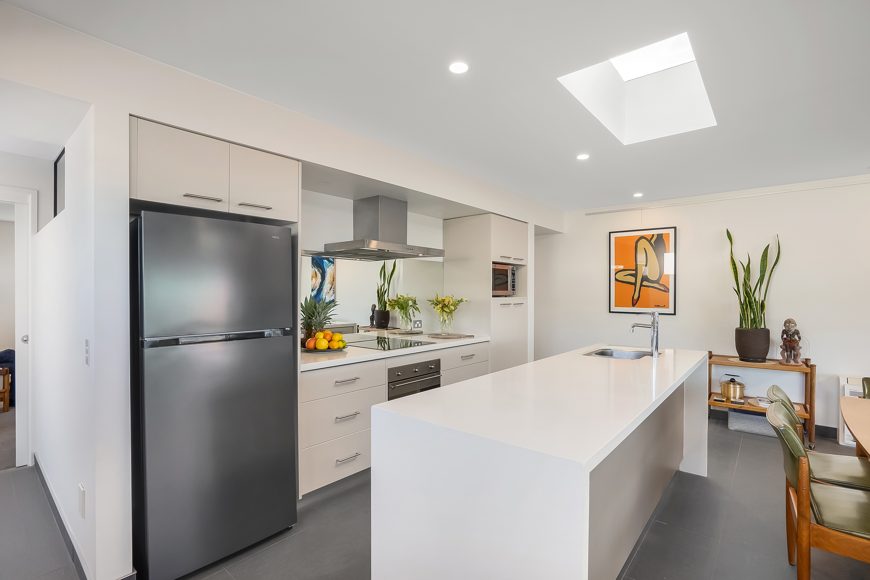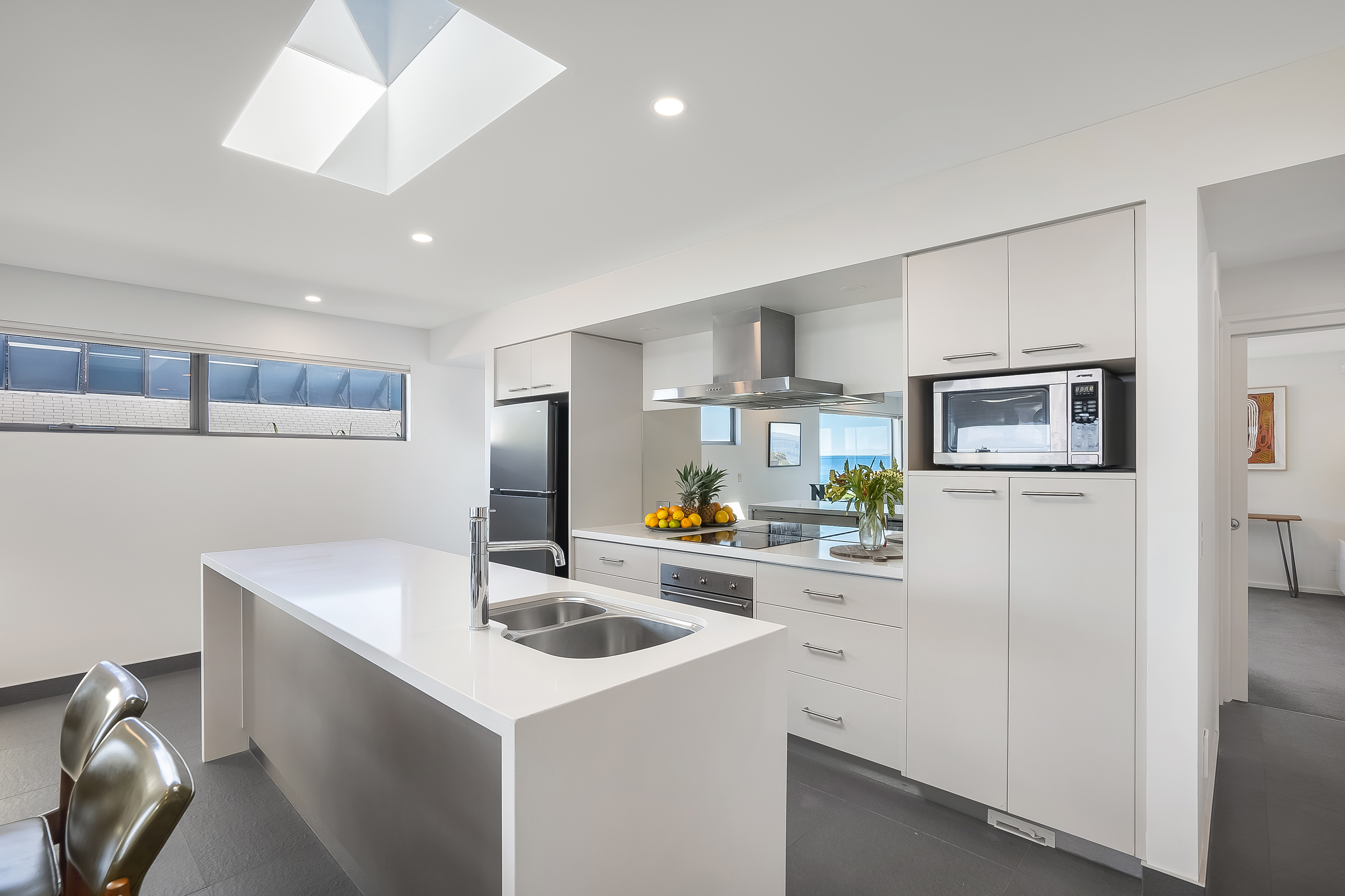 The kitchen offers a sleek and elegant design in classic white with a large island bench, plenty of bench and storage space including a large pantry and an abundance of drawers offering excellent utility. The clever design of the kitchen with the mirror splashback takes in the stunning water vista, making this a delightful space to cook in.