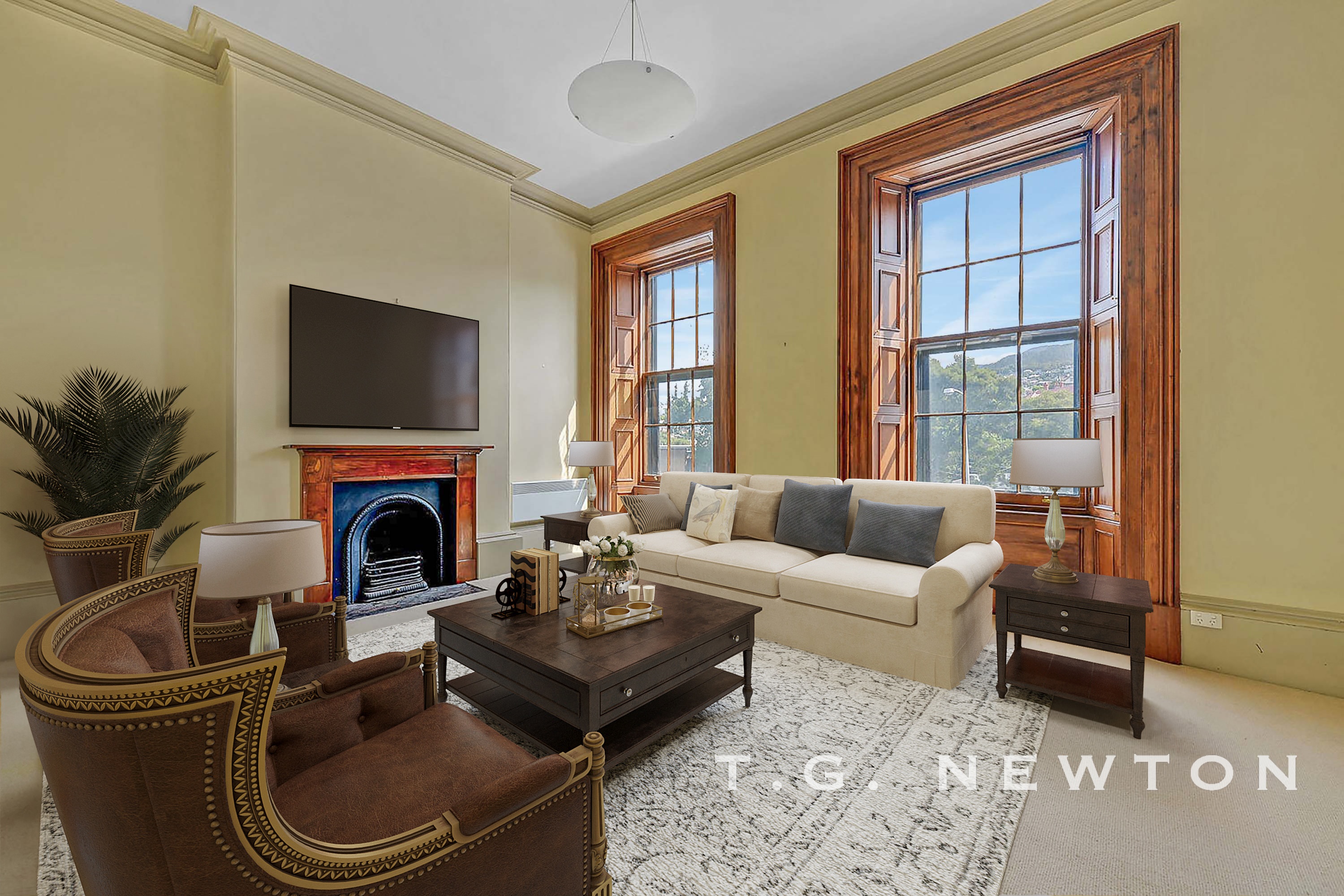 Commanding a striking presence within the heart of Hobart's bustling bar, restaurant and cafe precinct, the home is a landmark icon that stands tall and is sure to inspire. Majestic ceilings soar to heights of up to 12.5ft, inviting a sense of scale through the formal reception rooms and up toward the open-plan living and dining areas, where period features define the elegance of the bygone era with internal timber shutters, ornate cornices and breathtaking fireplaces.