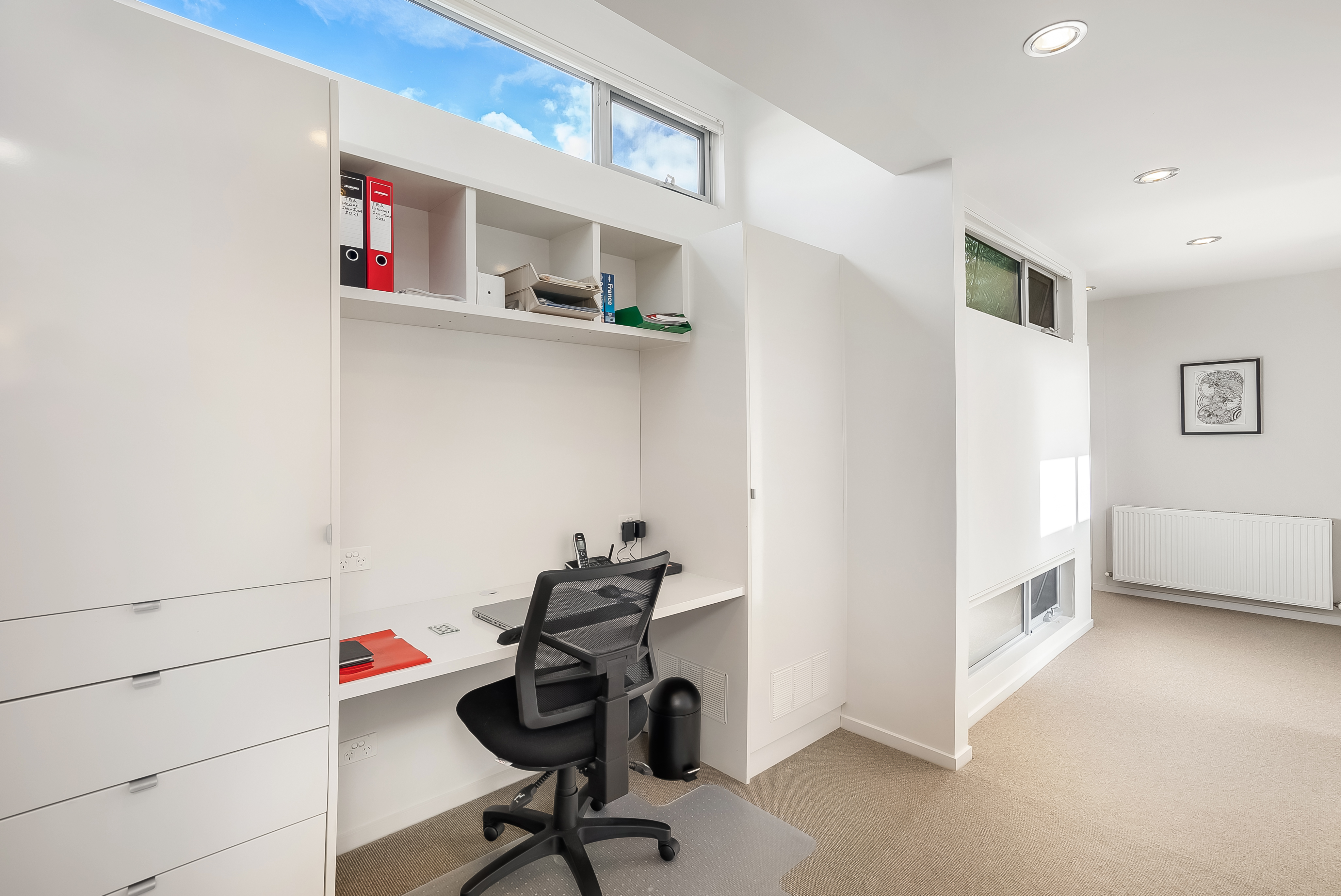 The integrated office nook provides the perfect home office space with a built-in desk and ample cupboard and drawer space. One of the linen cupboards has been converted into a wine cellar with capacity for almost 200 bottles.