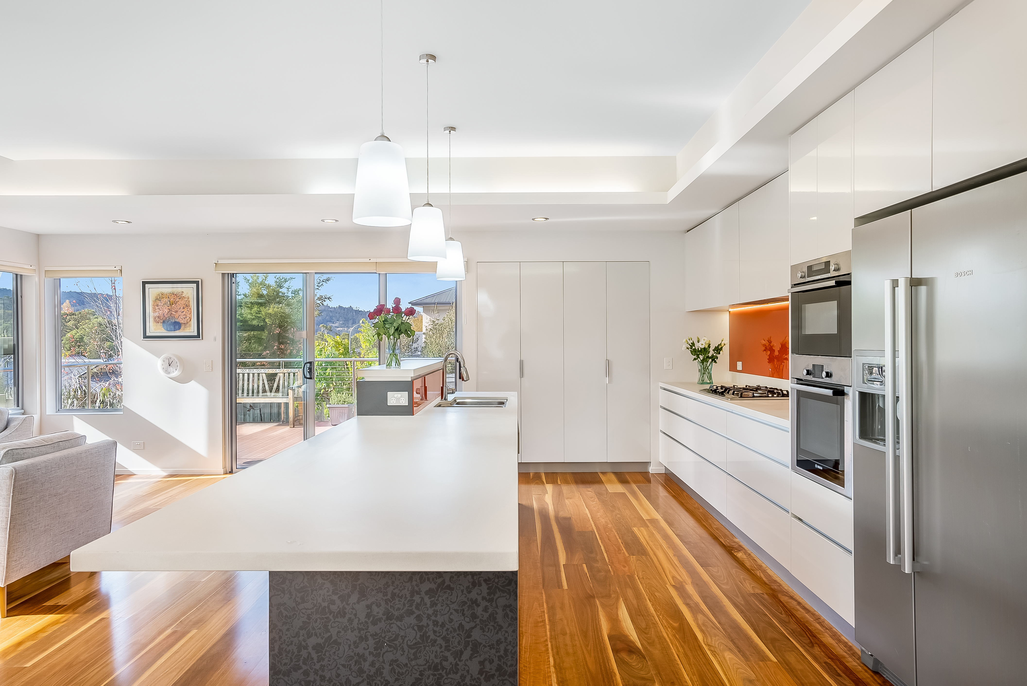 Ideal for entertaining or for relaxed family life, the spacious open plan living area is truly the heart of the home that opens out onto a private and sunny deck that is the ideal place for outdoor entertaining and alfresco dining. The stylish kitchen attractively blends classic white cabinetry, a surplus of drawers providing utility, large pantry and crowned with top quality Bosch appliances including double-door fridge/freezer, dishwasher, pyrolytic oven and microwave/convection oven and gas cooktop. The formal loungeroom is centred around a luxuriant wood-burning convector fireplace making this the ideal space for a more intimate setting on colder winter evenings.