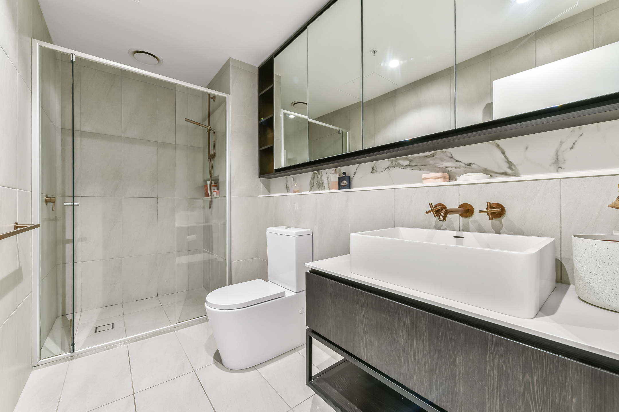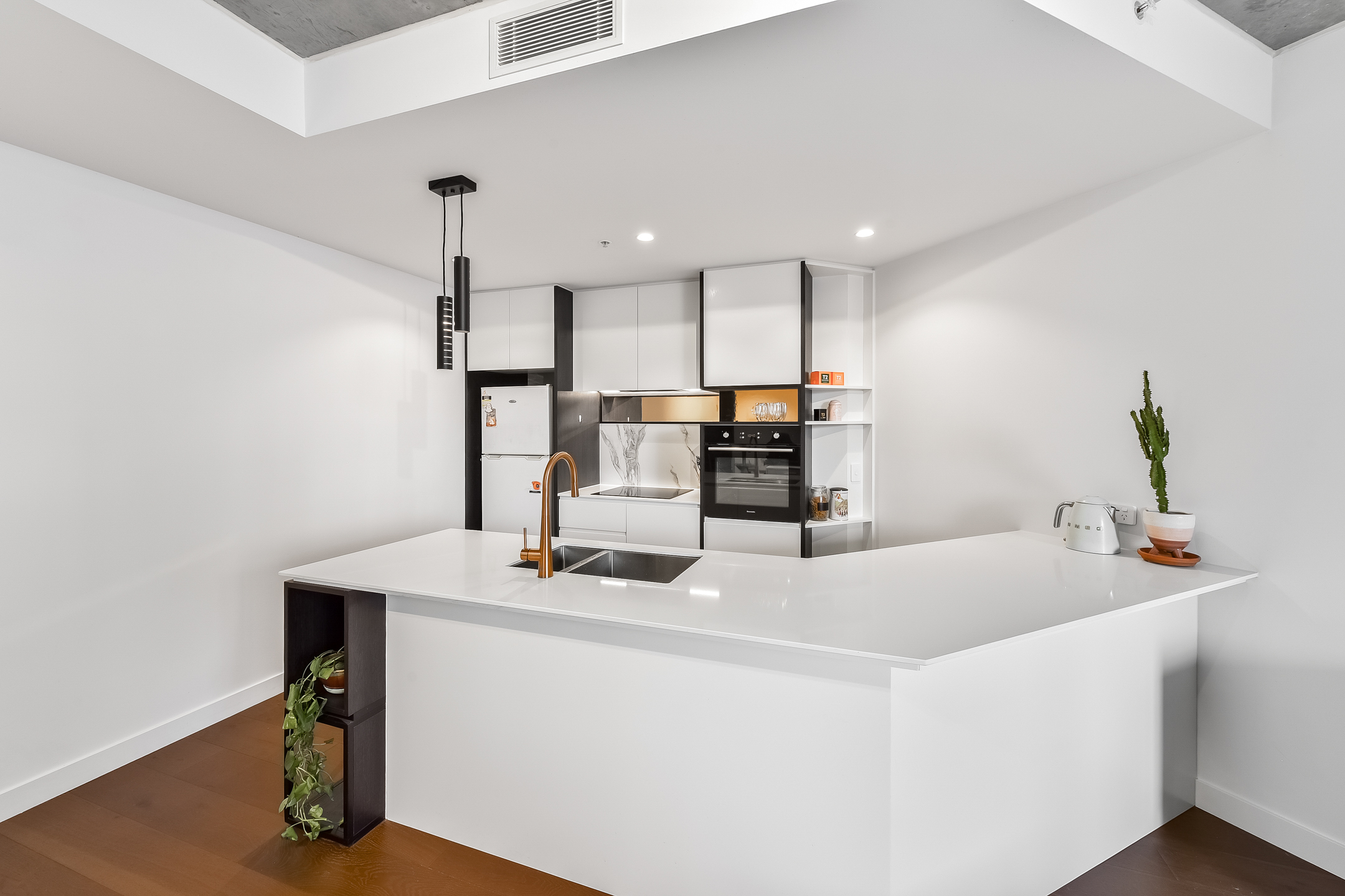 Stunning high-end finishes and world-class amenities can be found throughout the apartment and complex. The open-plan living and dining area with engineered timber flooring and exposed concrete ceiling is generously proportioned, flowing seamlessly onto a private undercover balcony. A sleek gourmet kitchen features stone benchtops, an induction cooktop, integrated dishwasher and plenty of clever storage, tailored for both entertaining and everyday ease. Two generous sized bedrooms, each with floor to ceiling built in wardrobes, are serviced by the fully tiled central bathroom with stone topped timber vanity and mirrored cabinet.