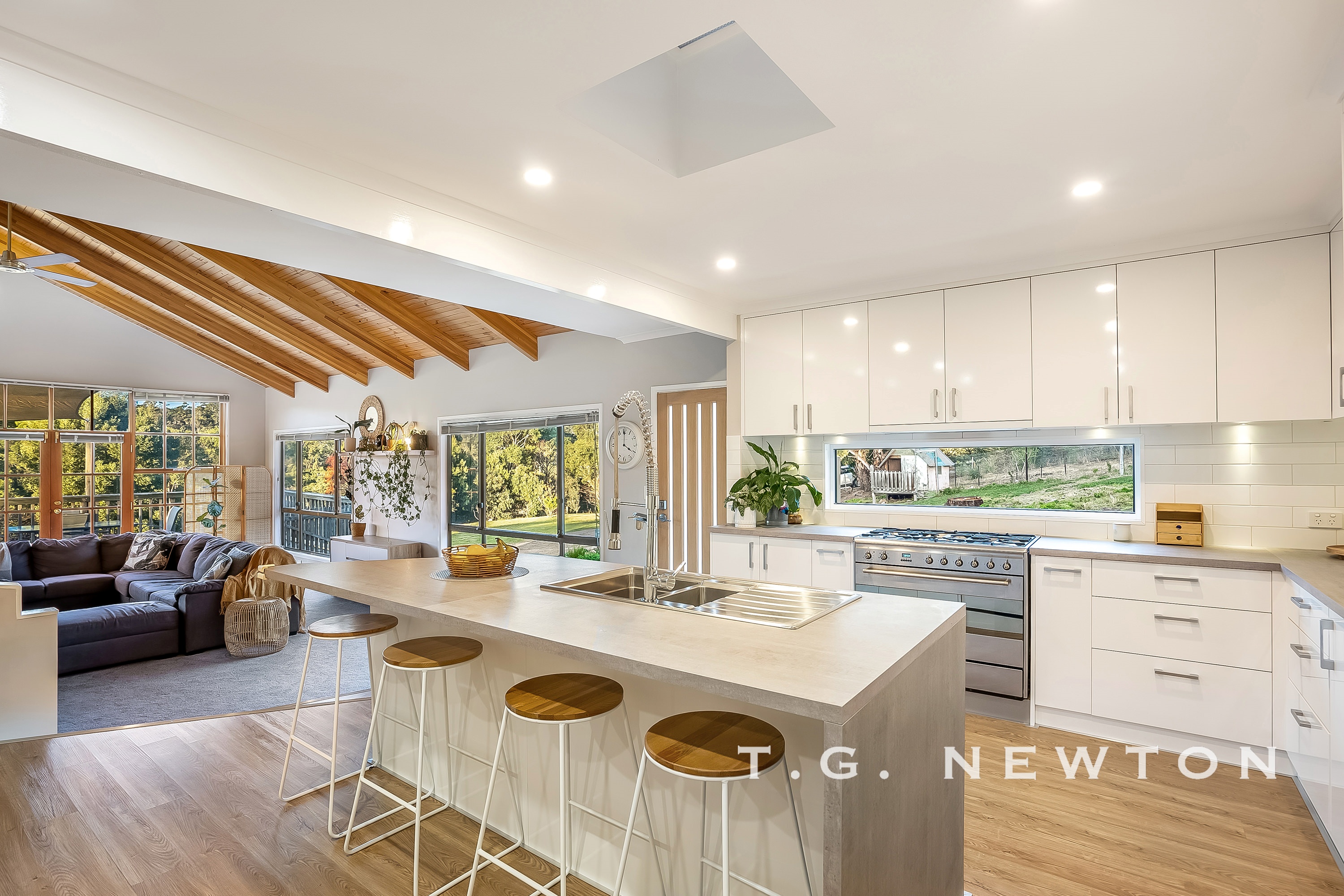 The property offers four bedrooms upstairs and two bathrooms. The immaculate kitchen featuring island bench and freestanding Smeg oven, is open to the dining and huge living area. The large living area is complimented by soaring raked ceilings, wood fire and all overlooking the picturesque mountain views. The home also benefits from a new ducted reverse cycle system that keeps the entire house comfortable year-round.