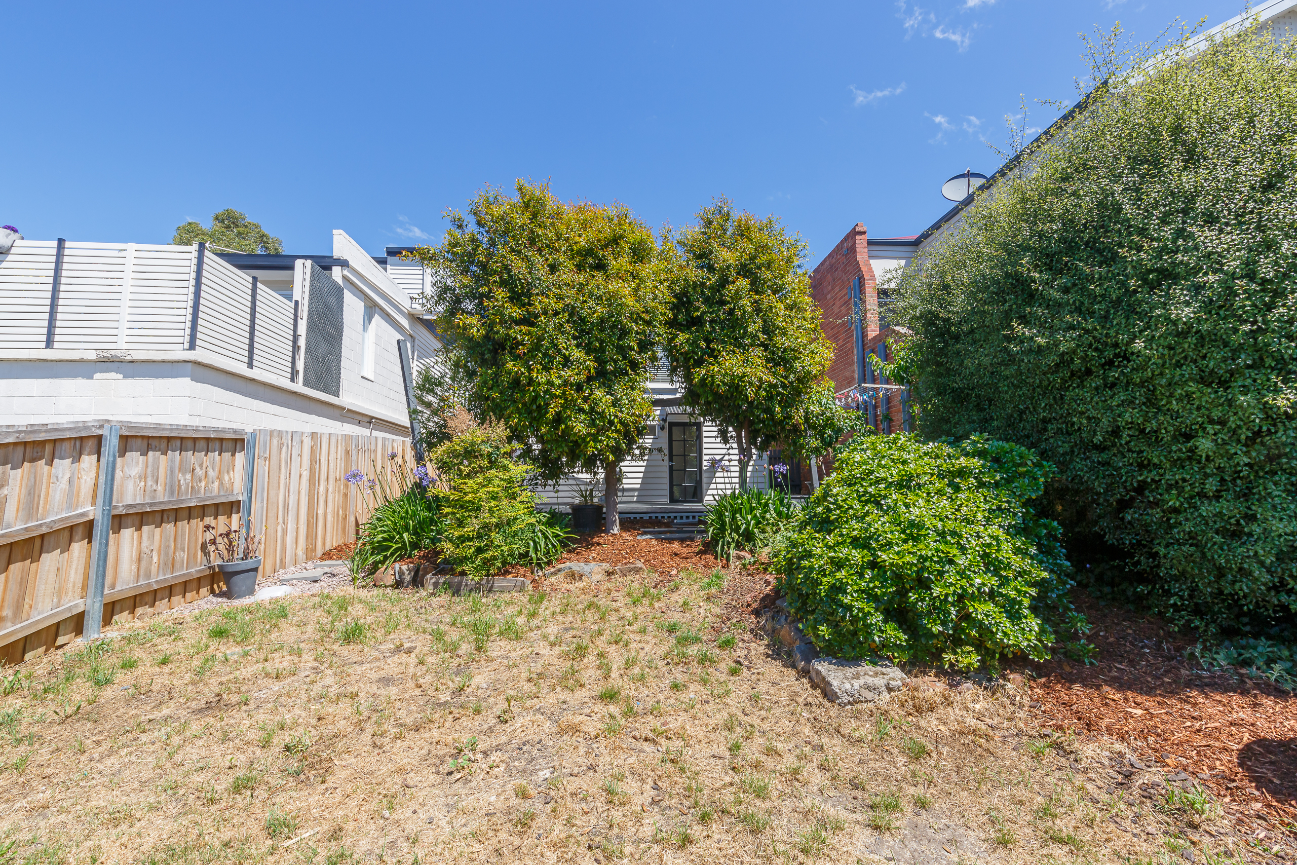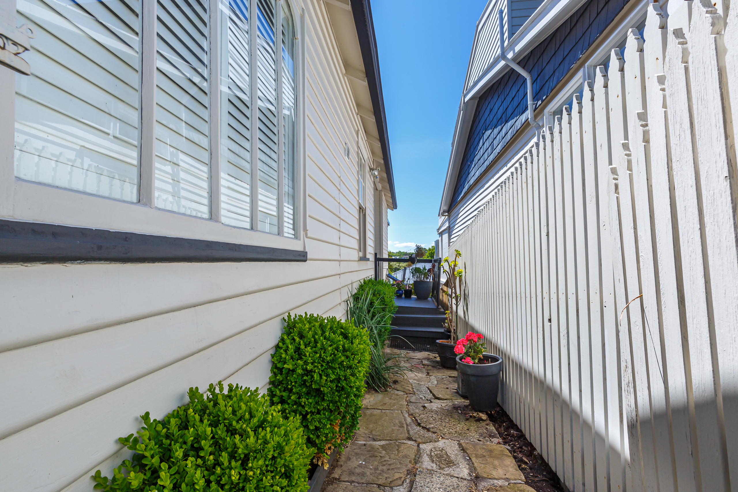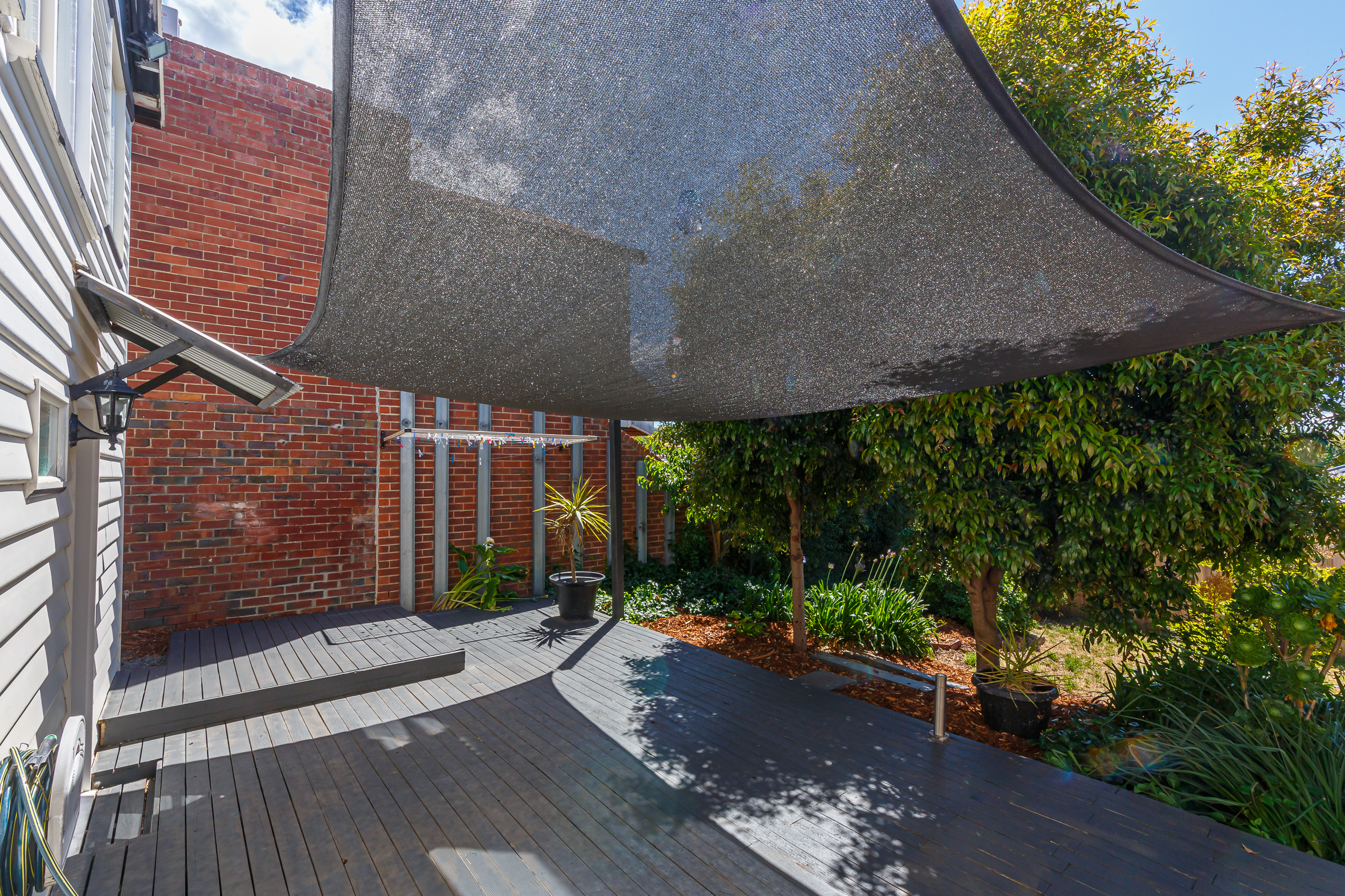 The stunning spiral staircase to the lower level reveals a second bedroom and a sitting room. There is also a second modern bathroom in addition to the laundry. The back door opens onto the timber deck with shade sail and rear yard with garden beds. There is a second courtyard in the front garden plus a small off-street parking space.