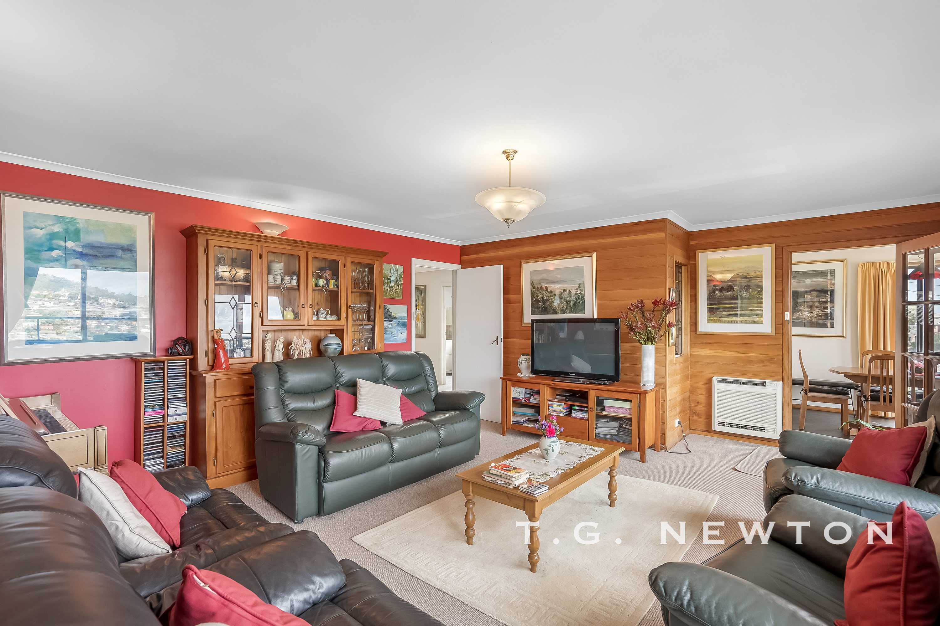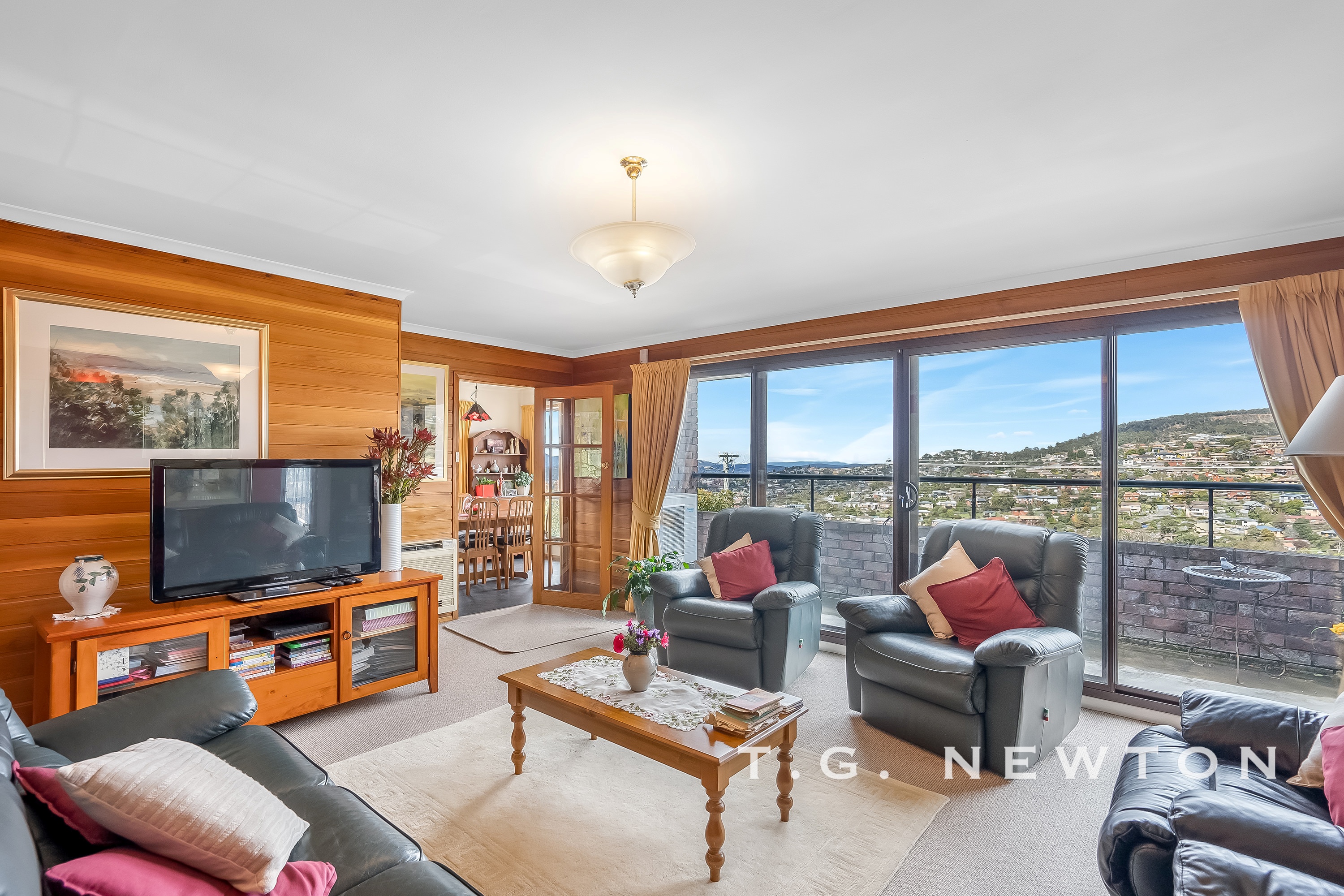 Up the stairs to the to top level, the living room is a fantastic size with an attached balcony through double sliding doors, capturing the stunning views over Lenah valley and across to the city. Adjacent is a study/bedroom option with additional built-ins, there is storage galore here! The kitchen/dining space has been modernised and also captures the panoramic views.