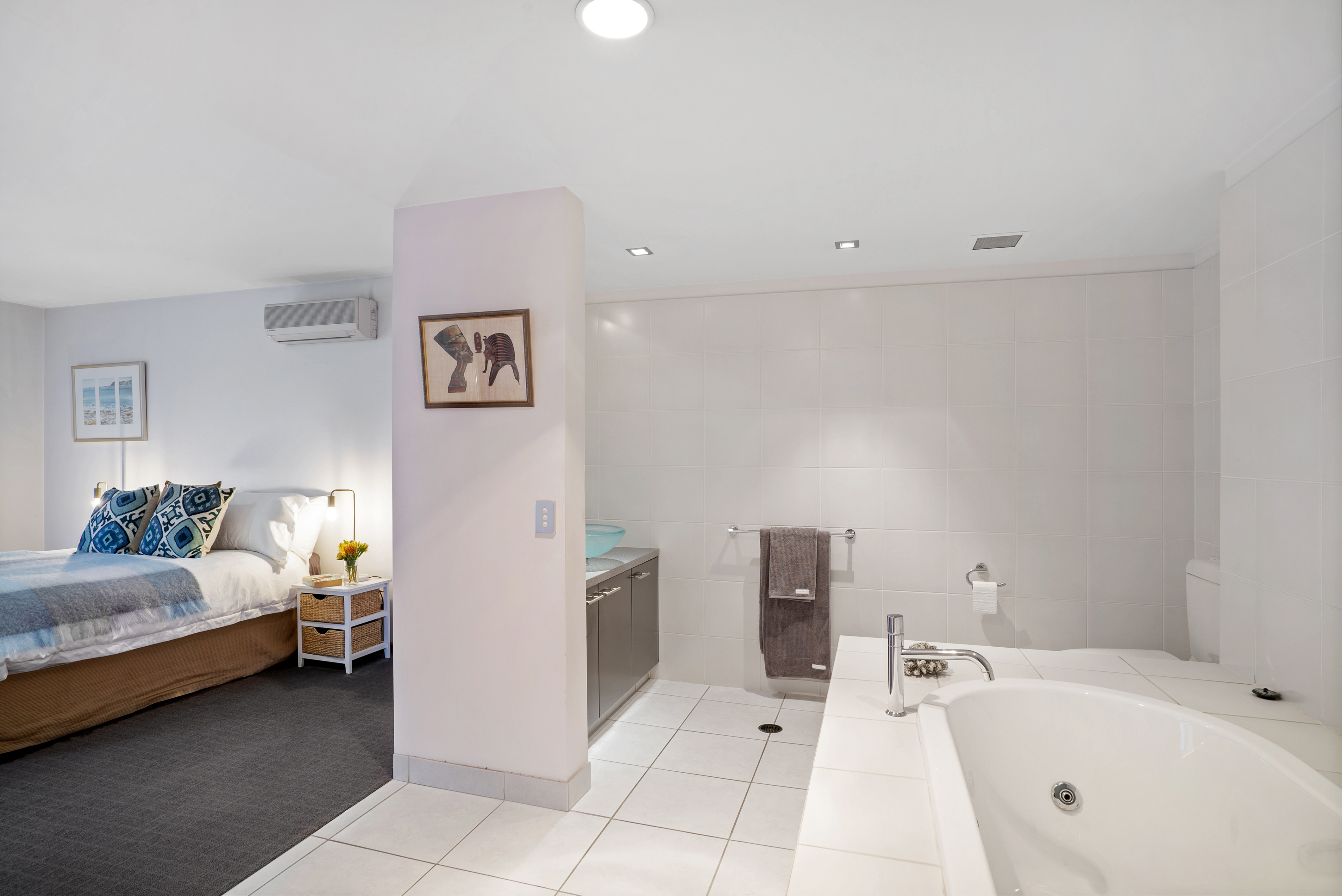Originally a three bedroom design, the third bedroom has been opened up to create an additional space connecting the open plan living area through to the second balcony. This area could easily be converted back into a third bedroom. The master suite opens out onto a balcony and has a private and indulgent ensuite with a deep spa bath and matching his and her vanities.