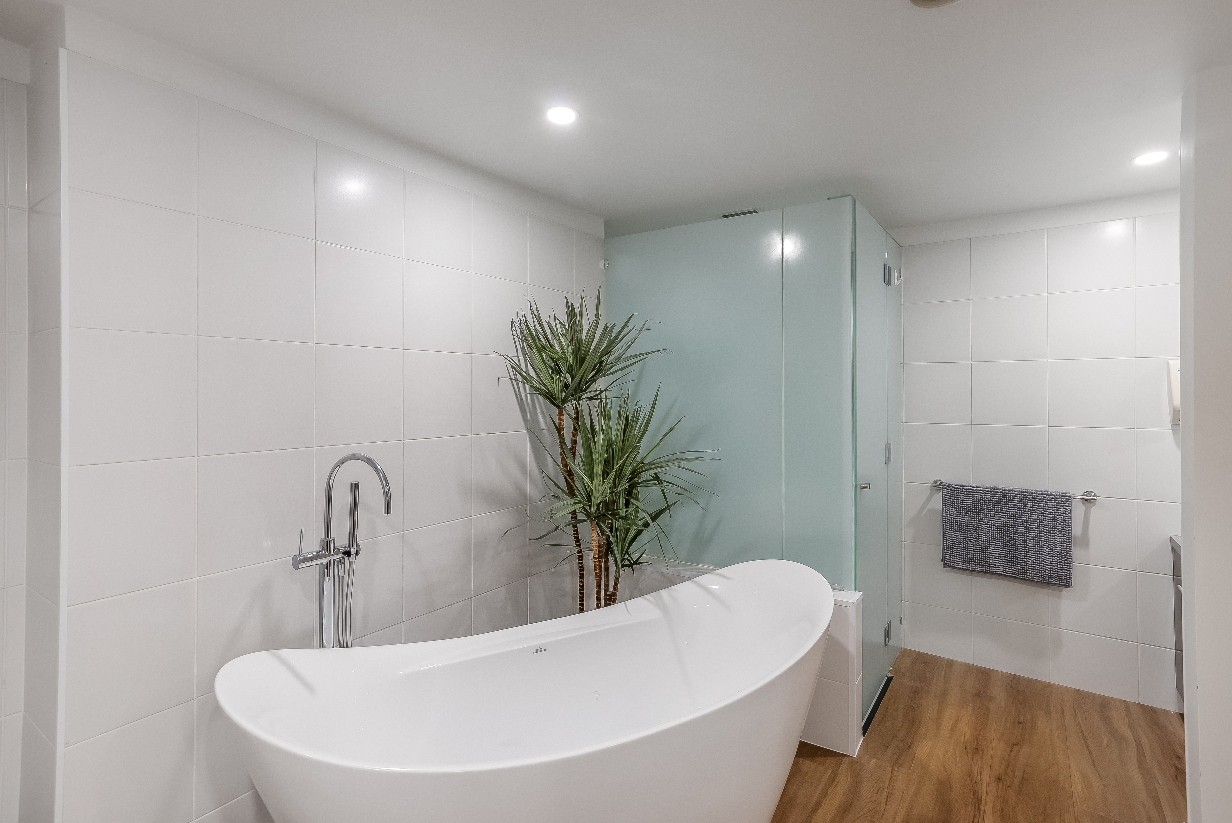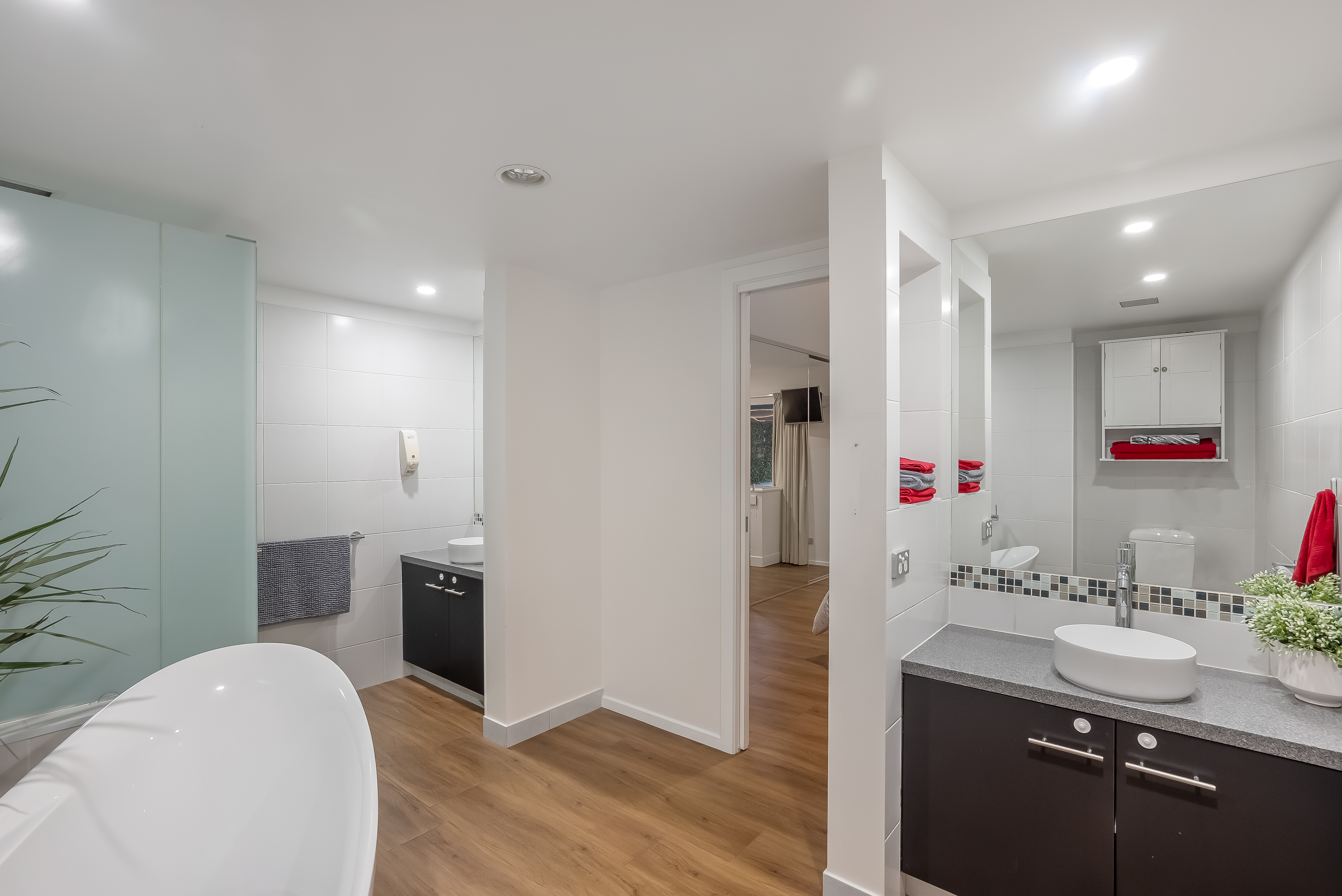 Two generous bedrooms at opposite ends of the apartment feature roomy built-in wardrobes and fabulous floor to ceiling windows, each opening through glass sliding doors to the outdoor areas. The master suite has a private and indulgent ensuite with a contemporary free-standing bathtub taking centre-stage plus his and her matching vanities.