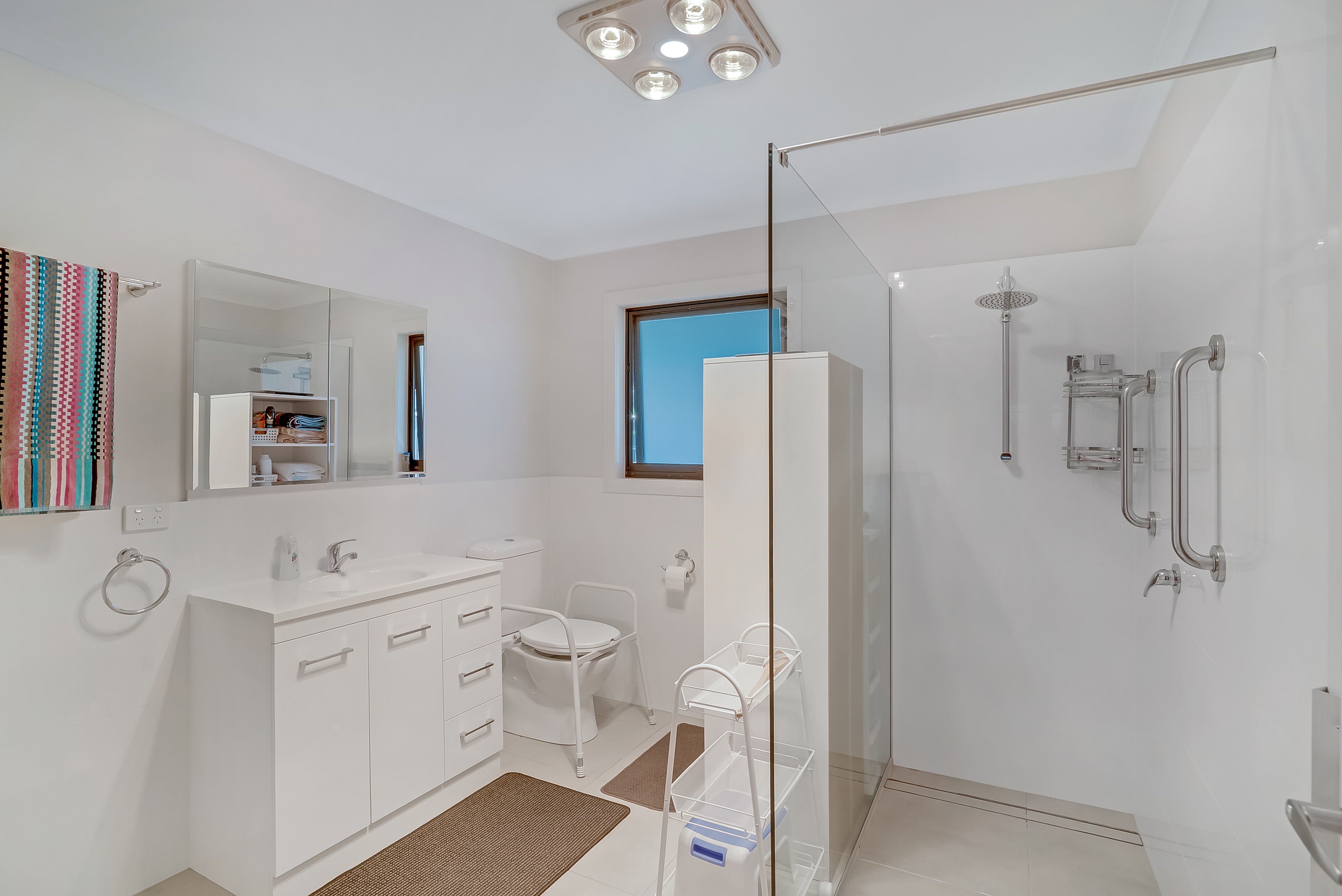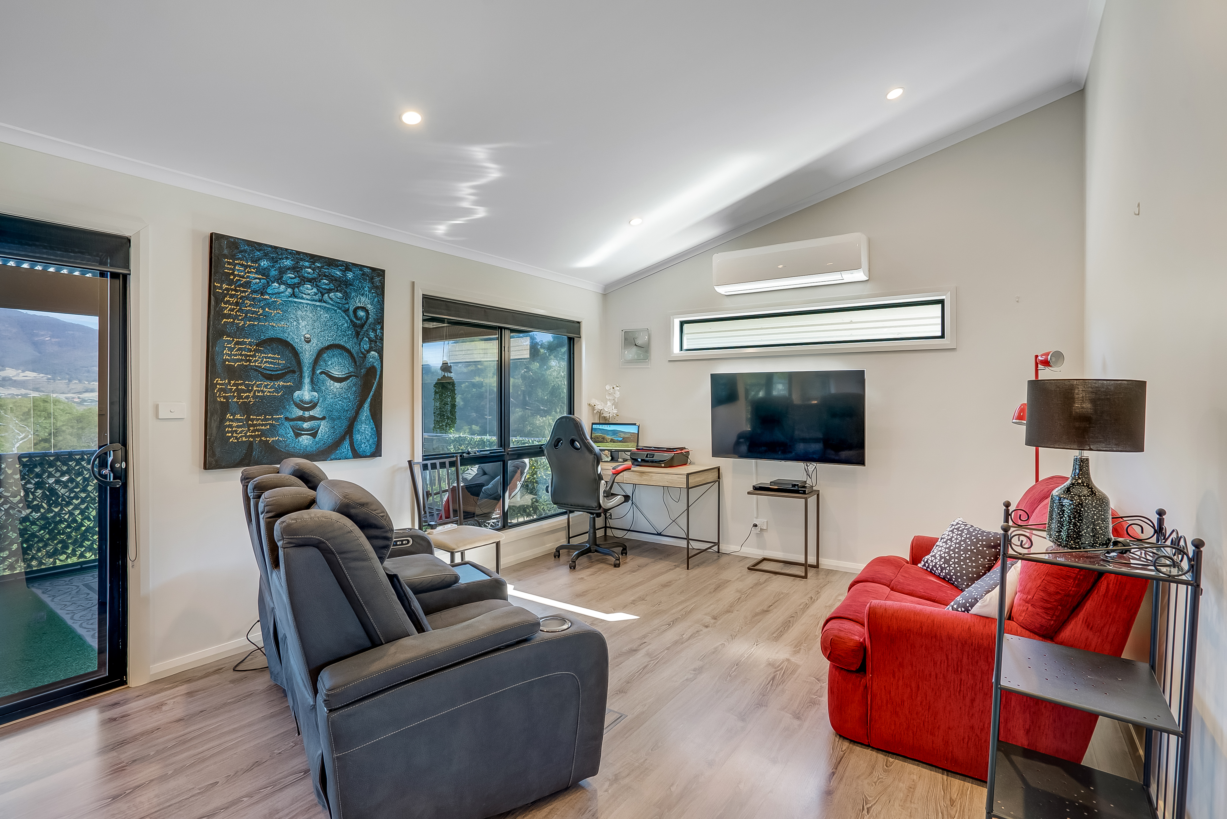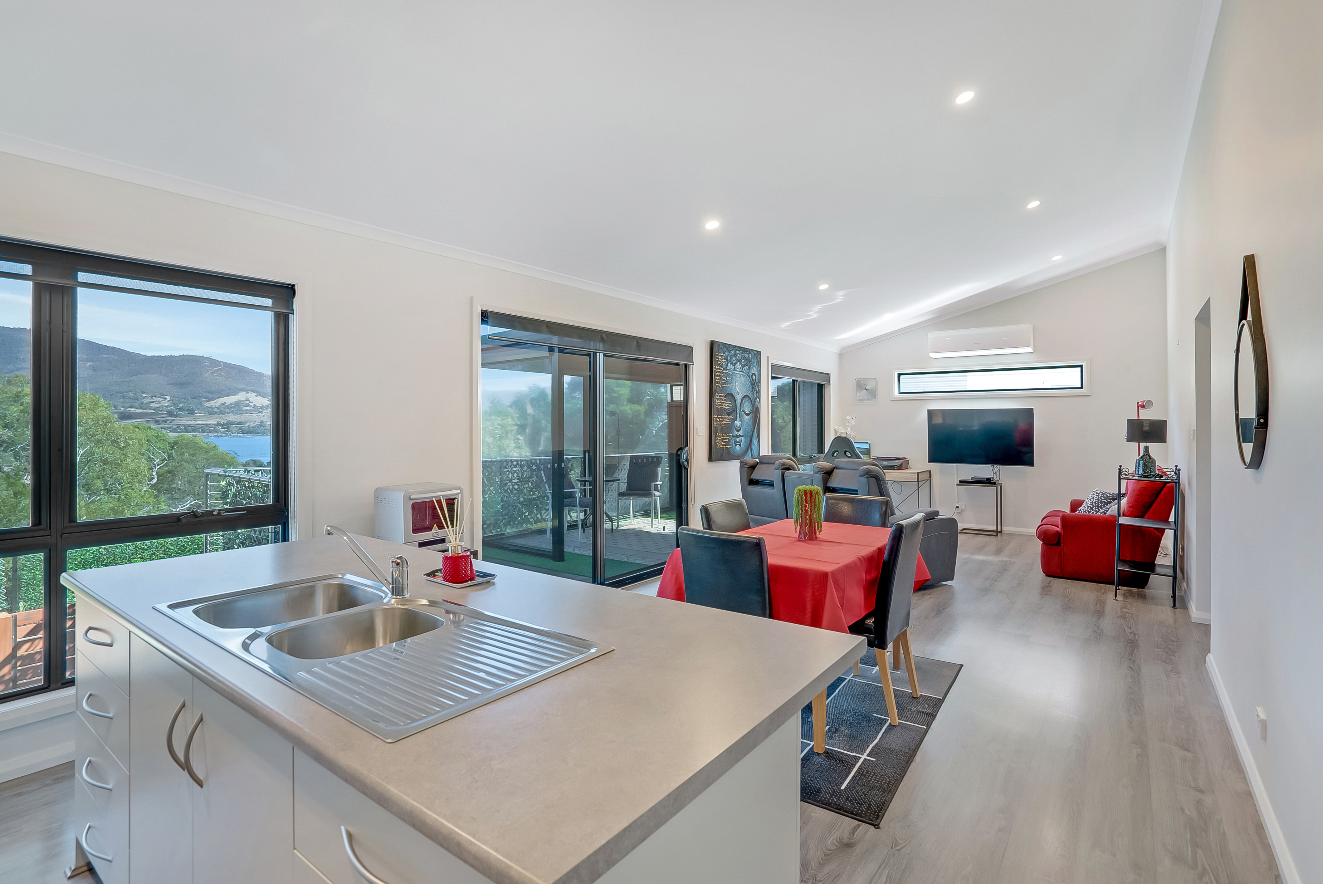 The open plan design living area receives plenty of natural sunlight and is easily heated or cooled with a reverse cycle air-conditioner.