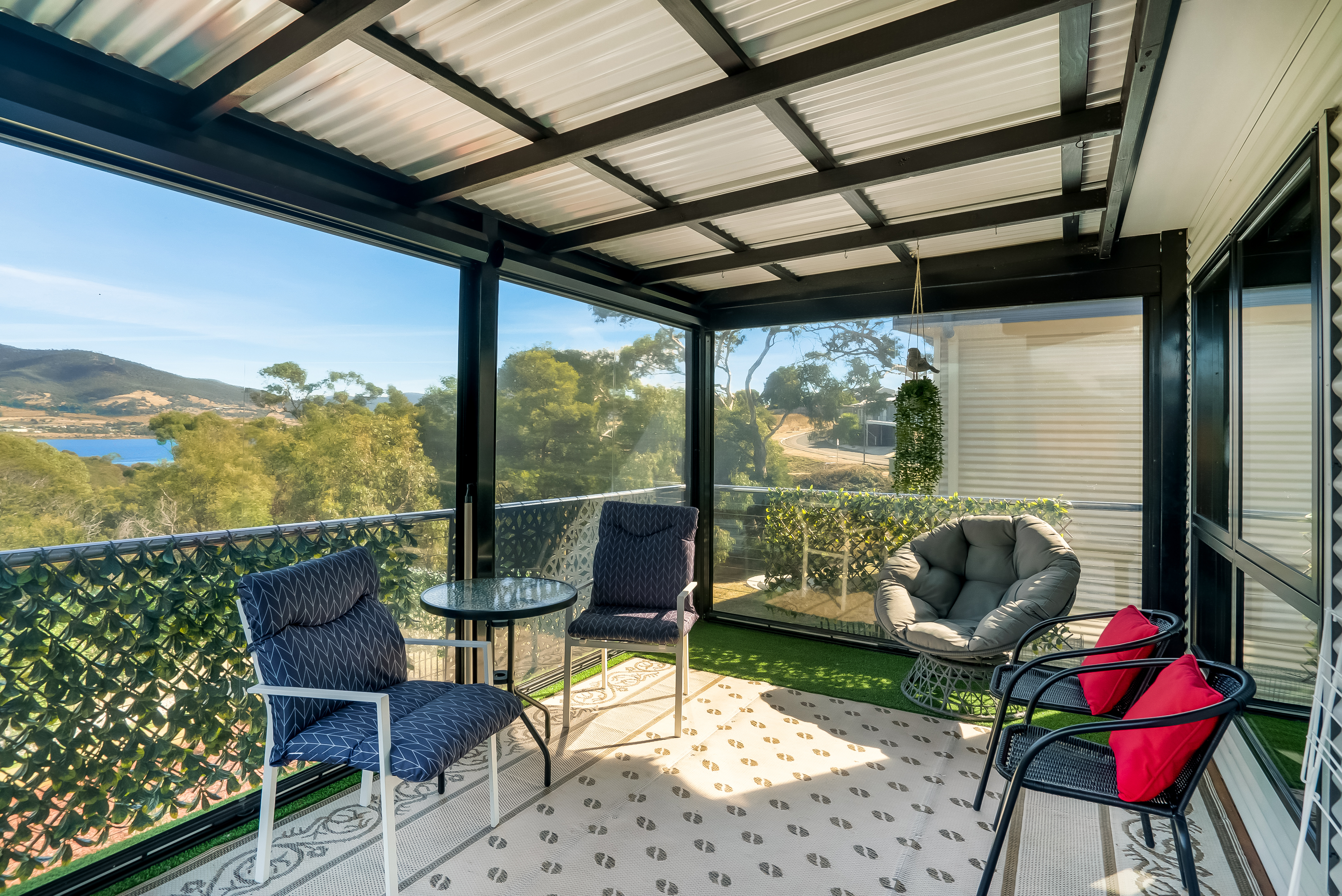 The outdoor partially enclosed deck creates a sunroom like warmth and overlooks the stunning surrounds - mountains, water and mature trees.