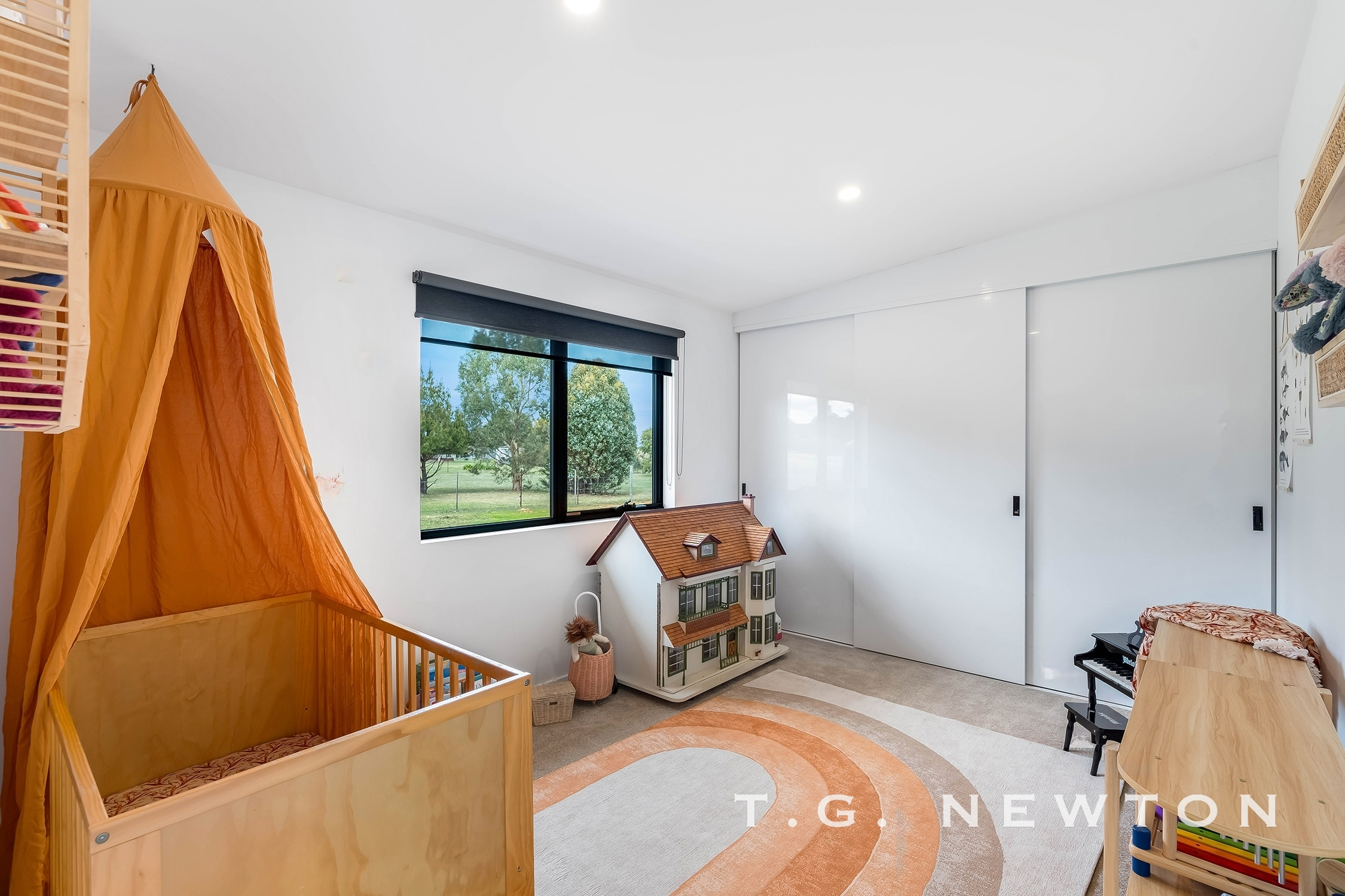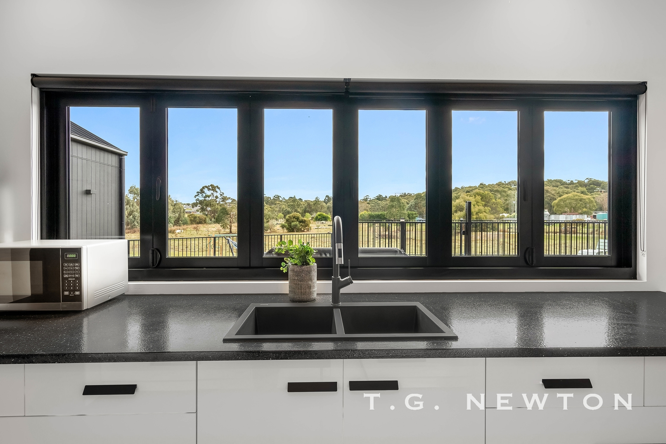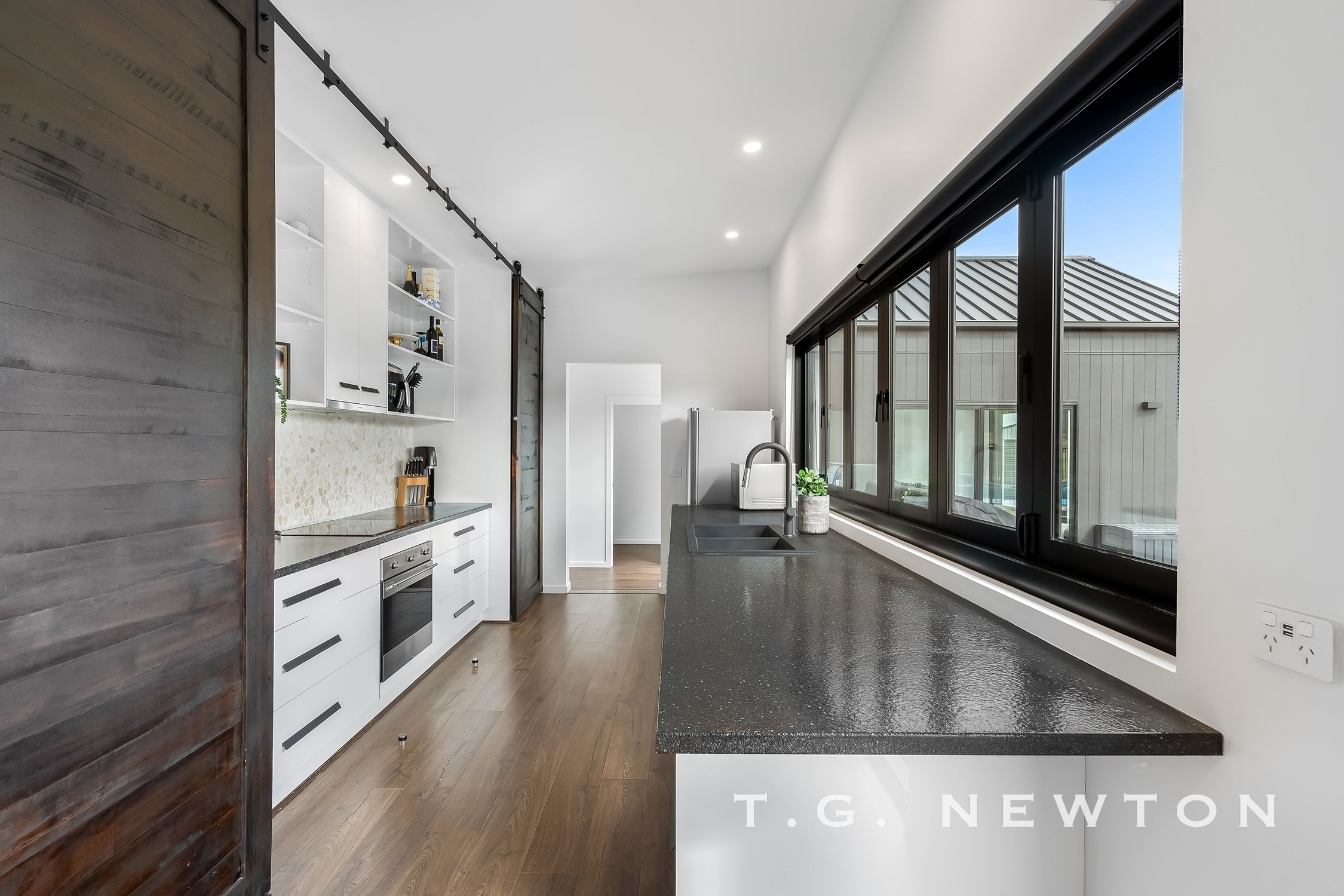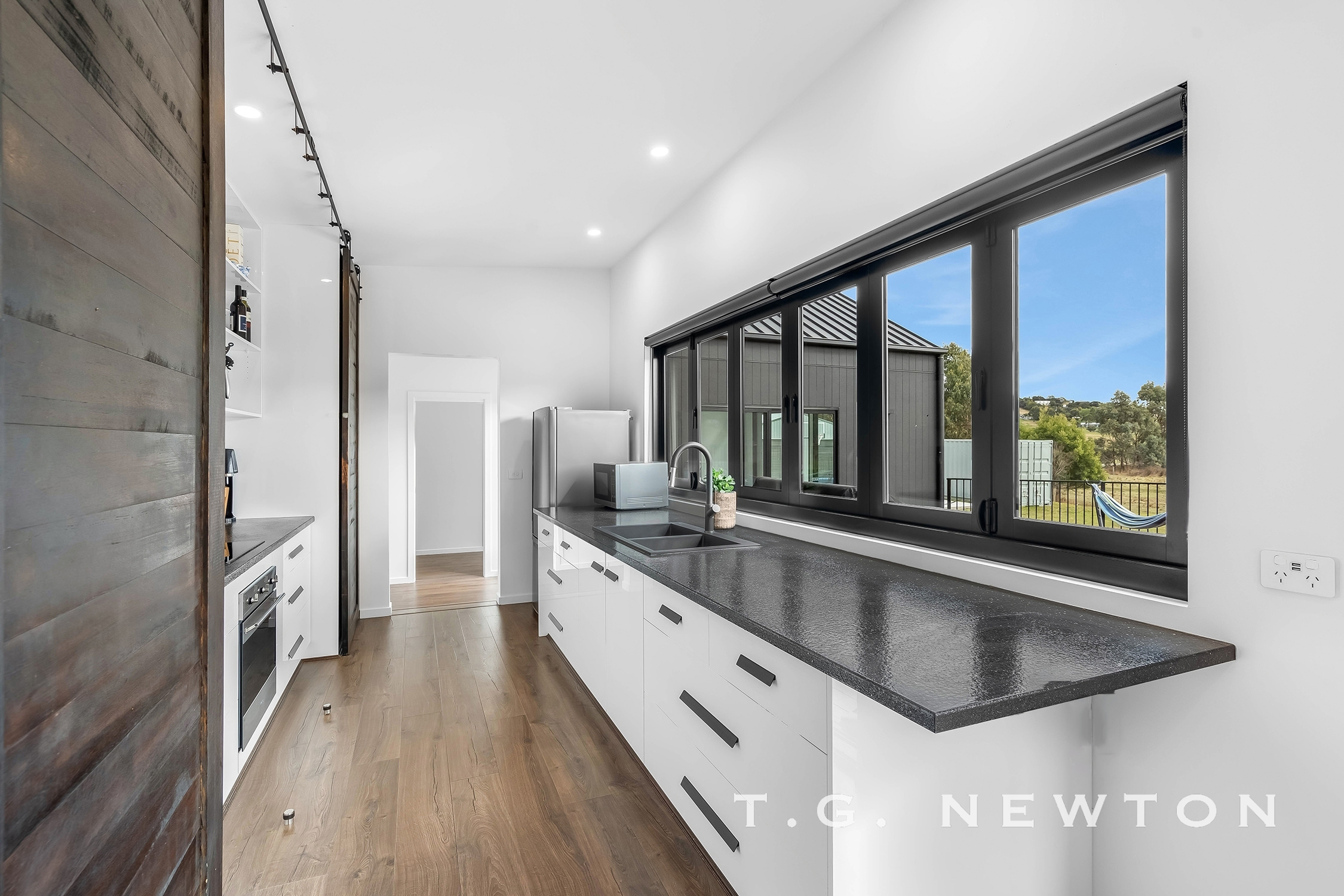 This recently built home boasts a sleek and stylish modern design. Throughout the home, you'll find ample bench space in the kitchen, an elegant stone splash back, and stylish barnyard doors covering the pantries, creating a striking and functional focal point. The double blinds throughout the house allow you to control the light and privacy to your liking, maintaining the light-filled ambiance it offers.