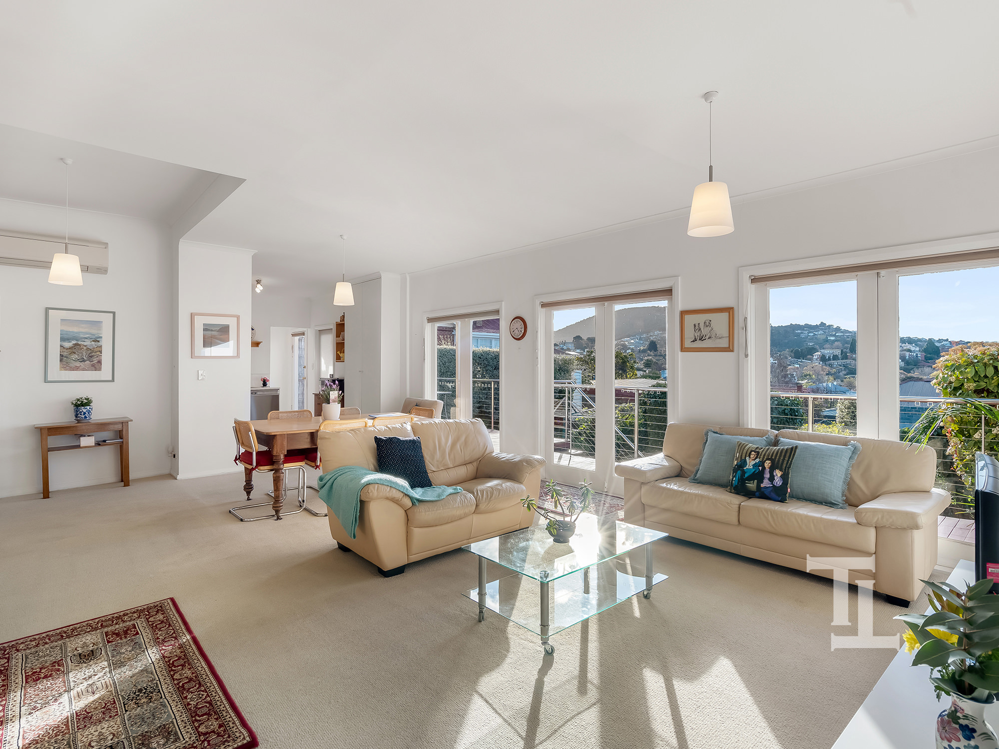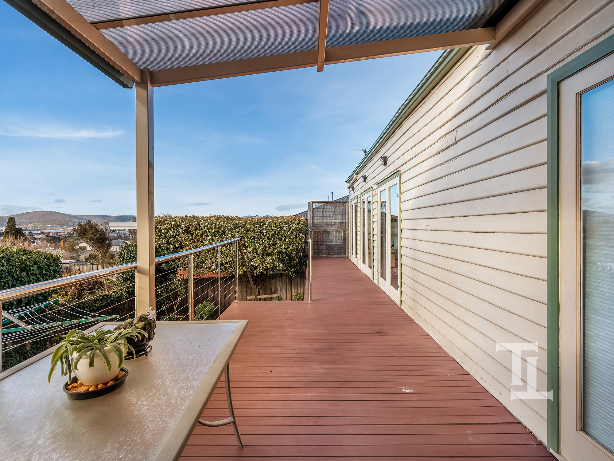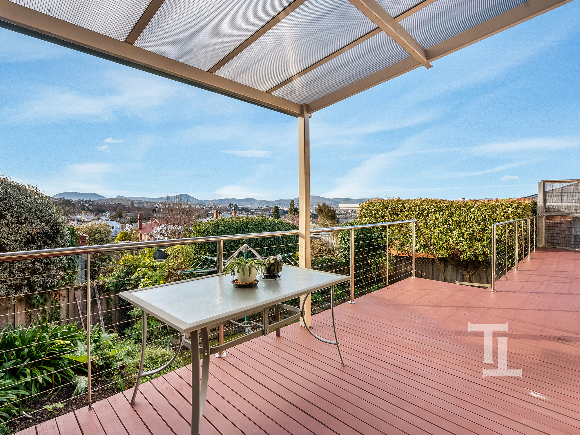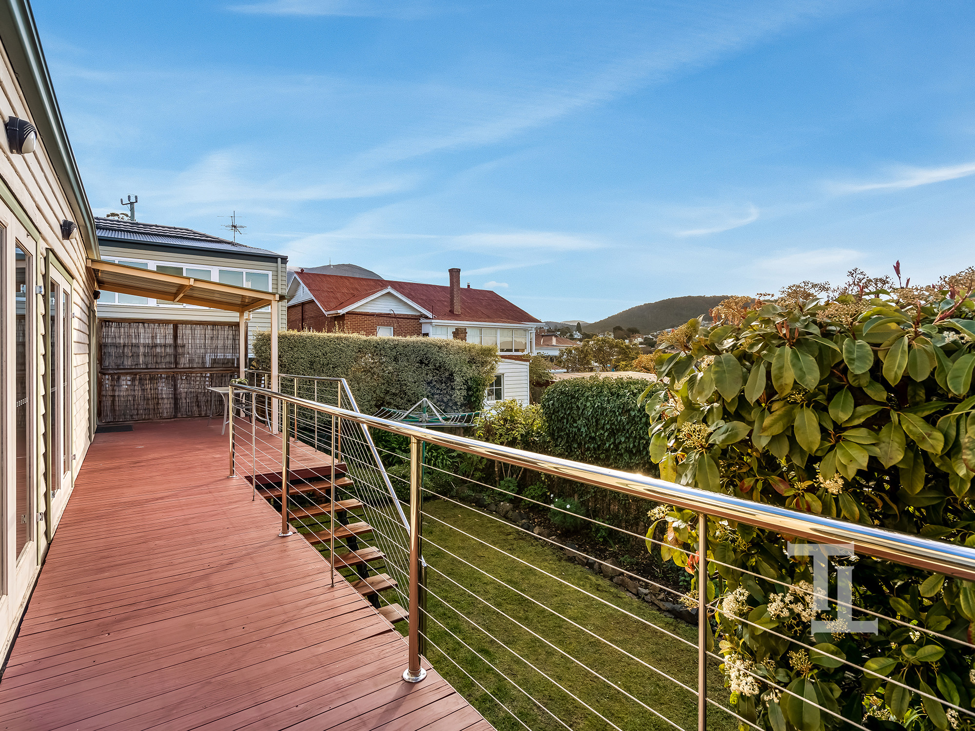The home offers three bedrooms (master with en-suite), a second bathroom, a modernised open plan living area where the kitchen, dining and living room open up onto the large rear deck overlooking the established yard and city of Hobart.
