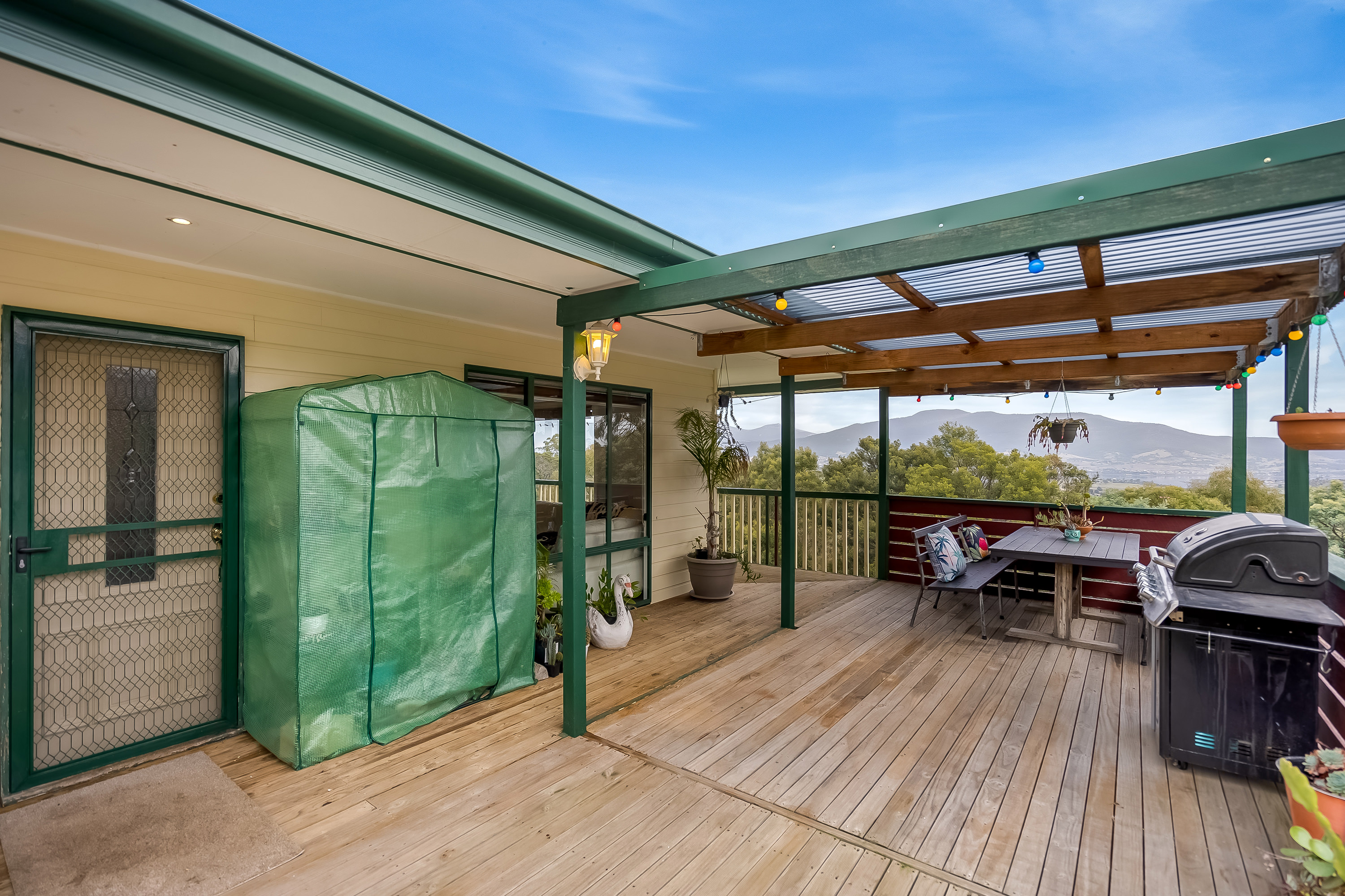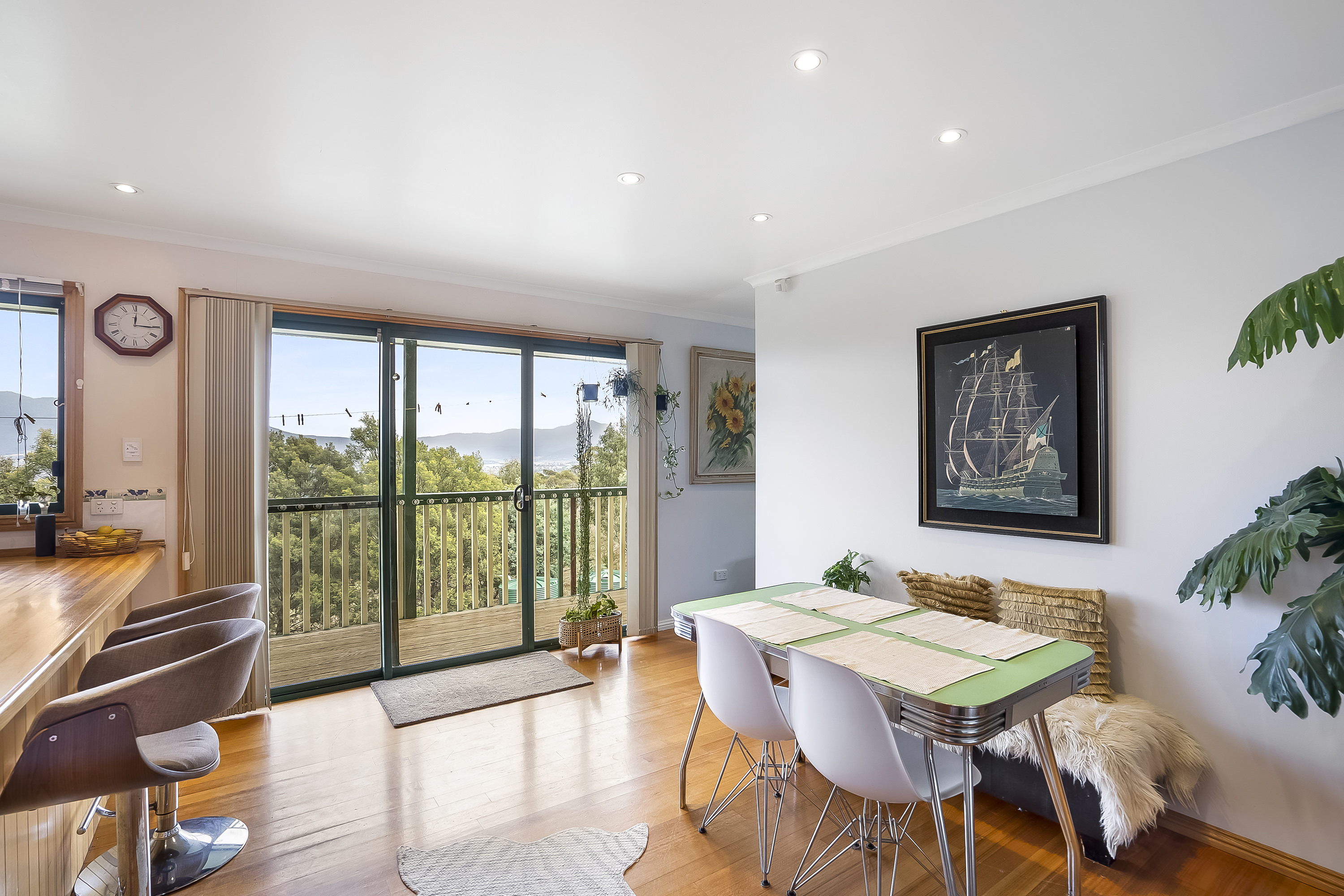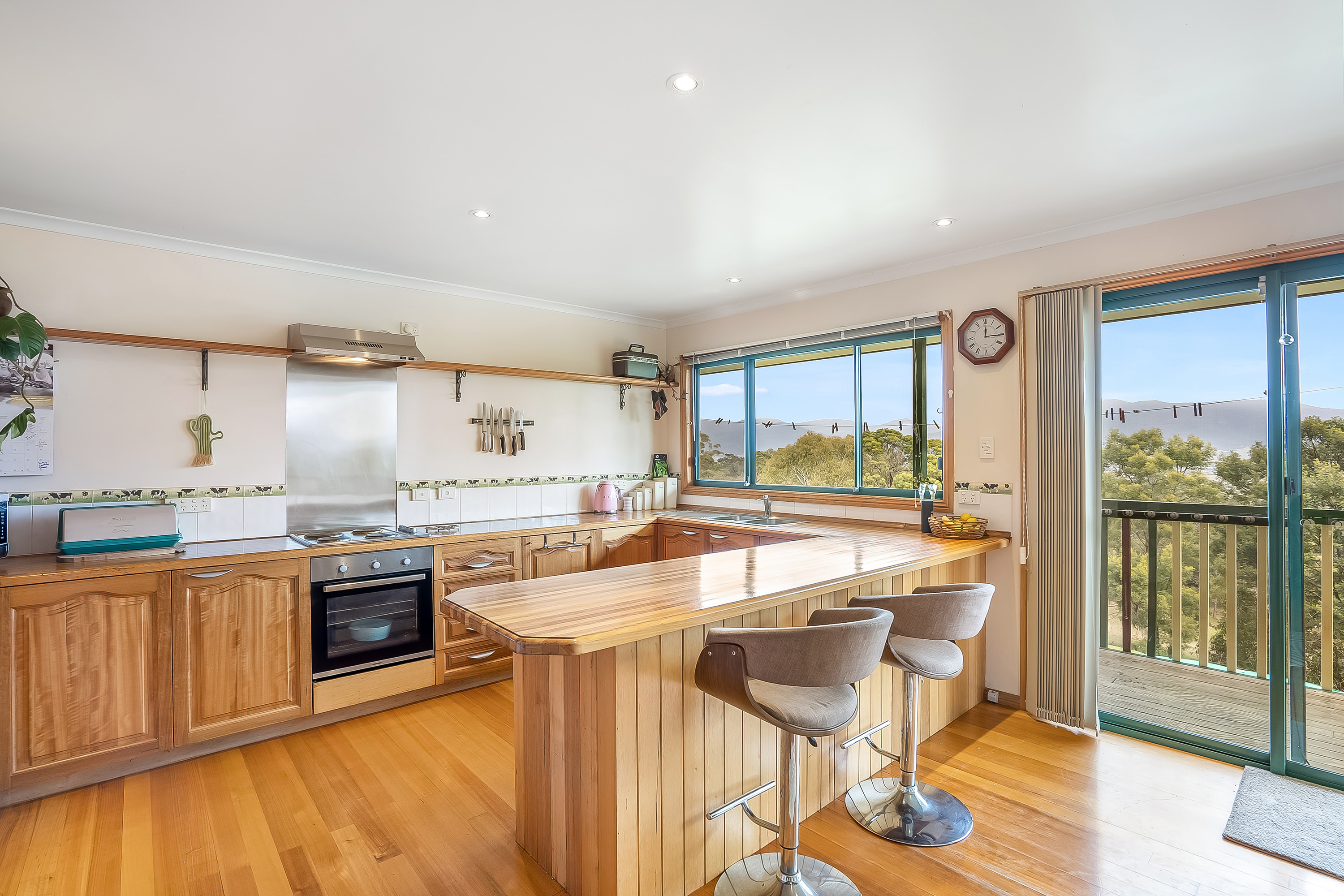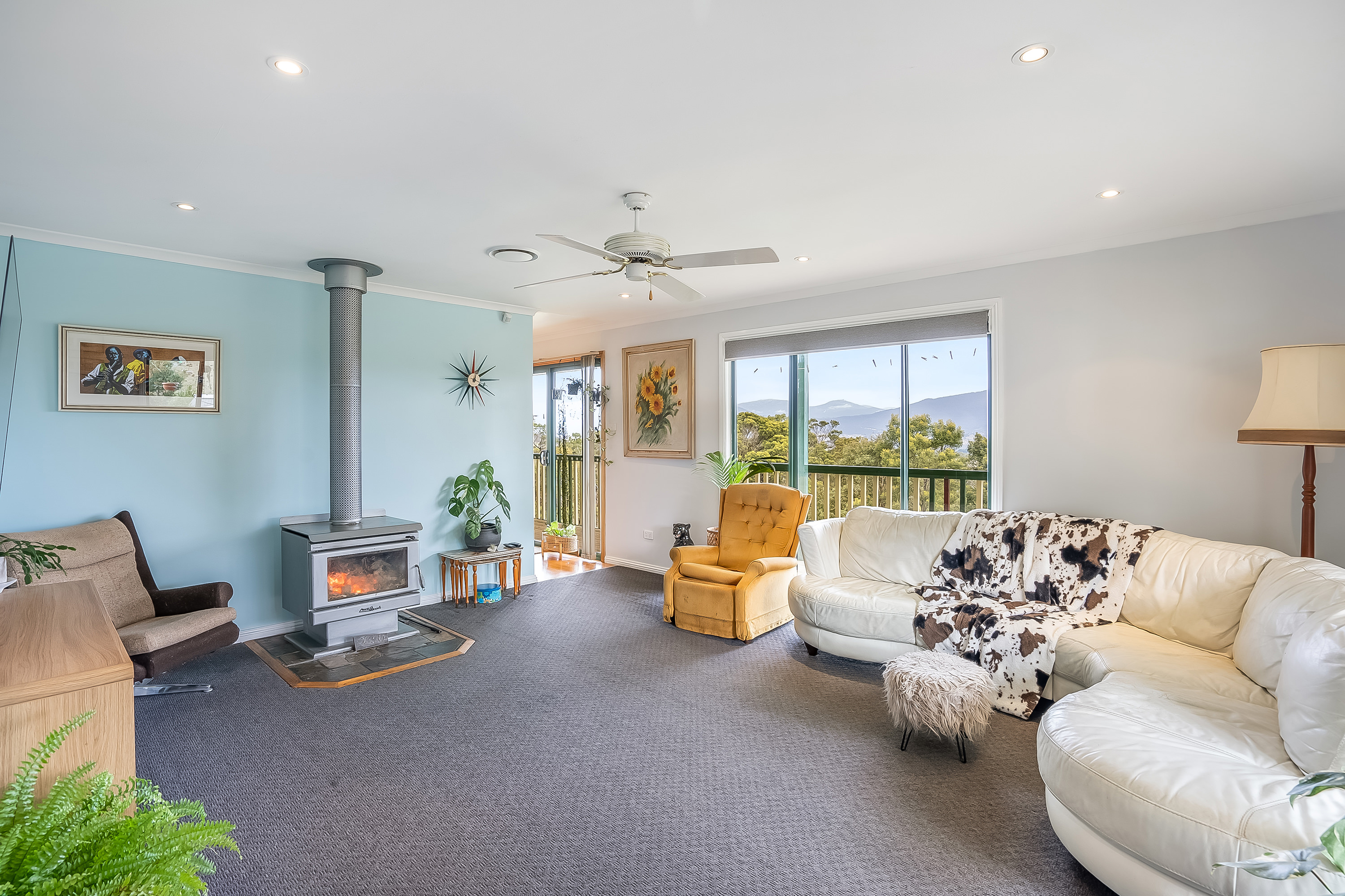 At the heart of this home is the open plan country-style kitchen and dining with a separate living area complete with a great wood heater to comfortably relax by with friends and family. From here, access the generous wrap-around verandah and entertaining deck, and drink in the sweeping views from Mount Dromedary, across the River Derwent and to the summit of Kunanyi / Mount Wellington.